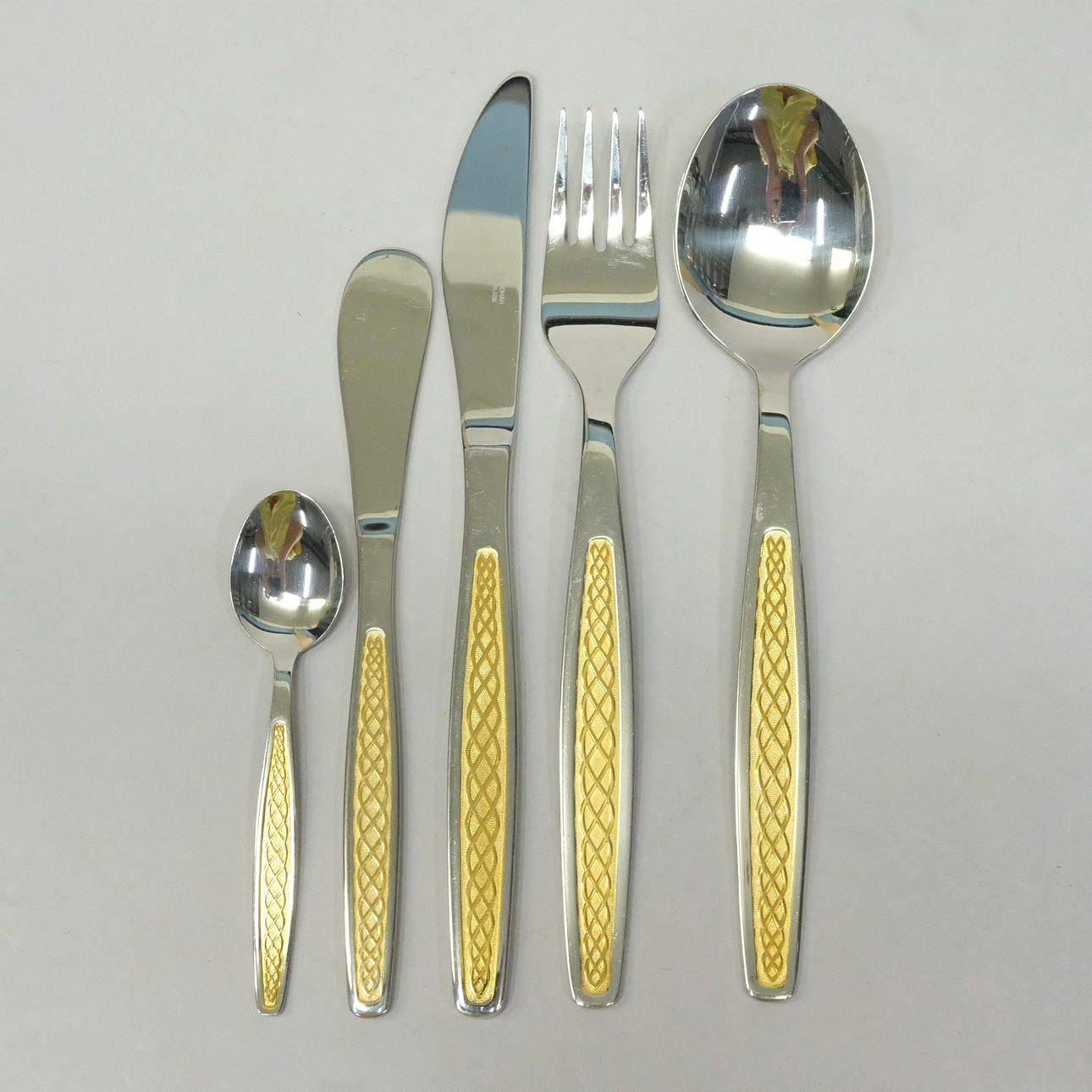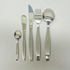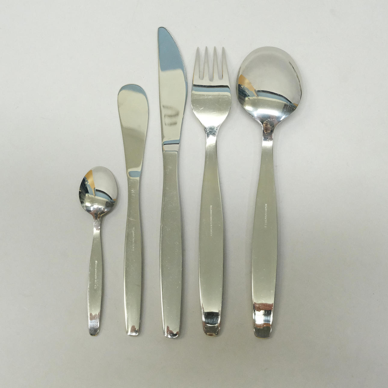 14 gafler, længde 19cm. 14 knive, længde 20,5cm. 12 skeer, længde 19cm. 12 kaffeskeer, længde 10,7cm. 6 smørknive, længde 16,5cm.