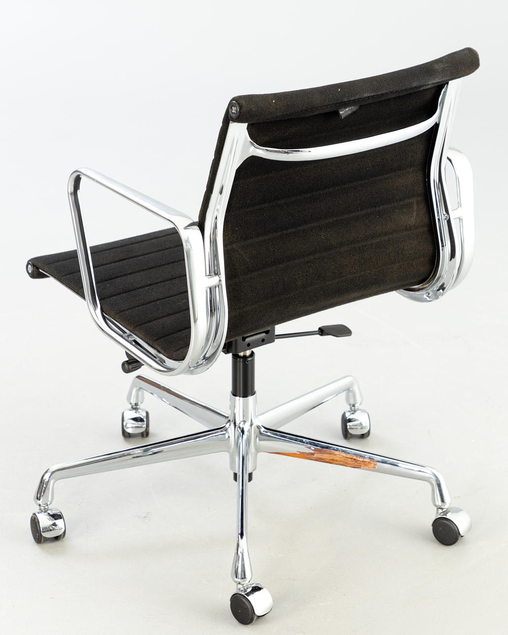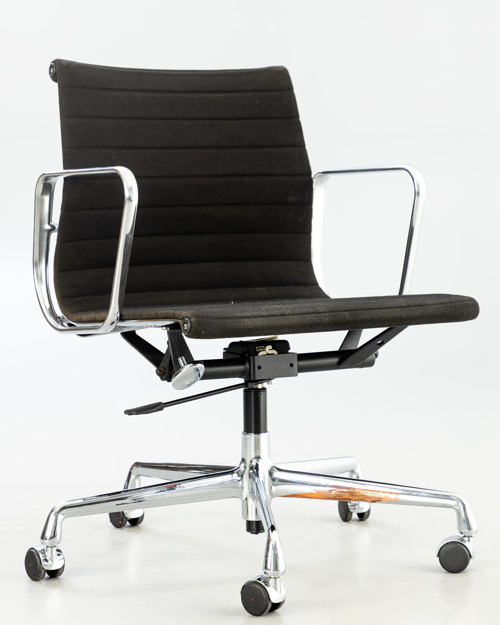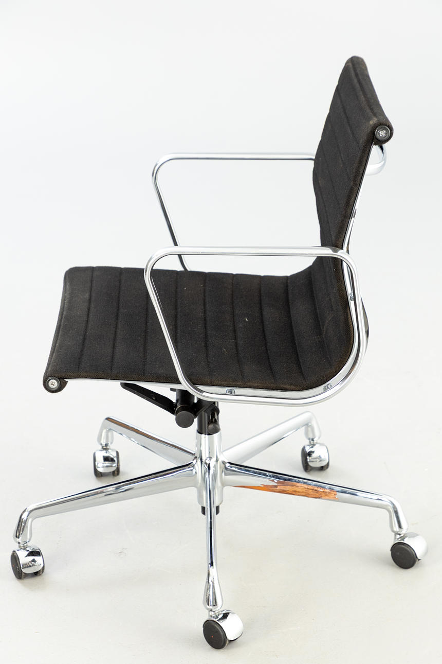 Vitra. 'EA 117' kontorstol af Ray & Charles Eames. Design: 1958. Udførelse med hopsak-dæksel og forkromet aluminiumsramme. Drejeligt 5-stjernet fod på hjul, højdejusterbar og med vippefunktion. Indskrevet med etiket.