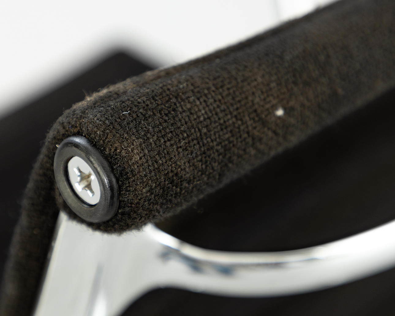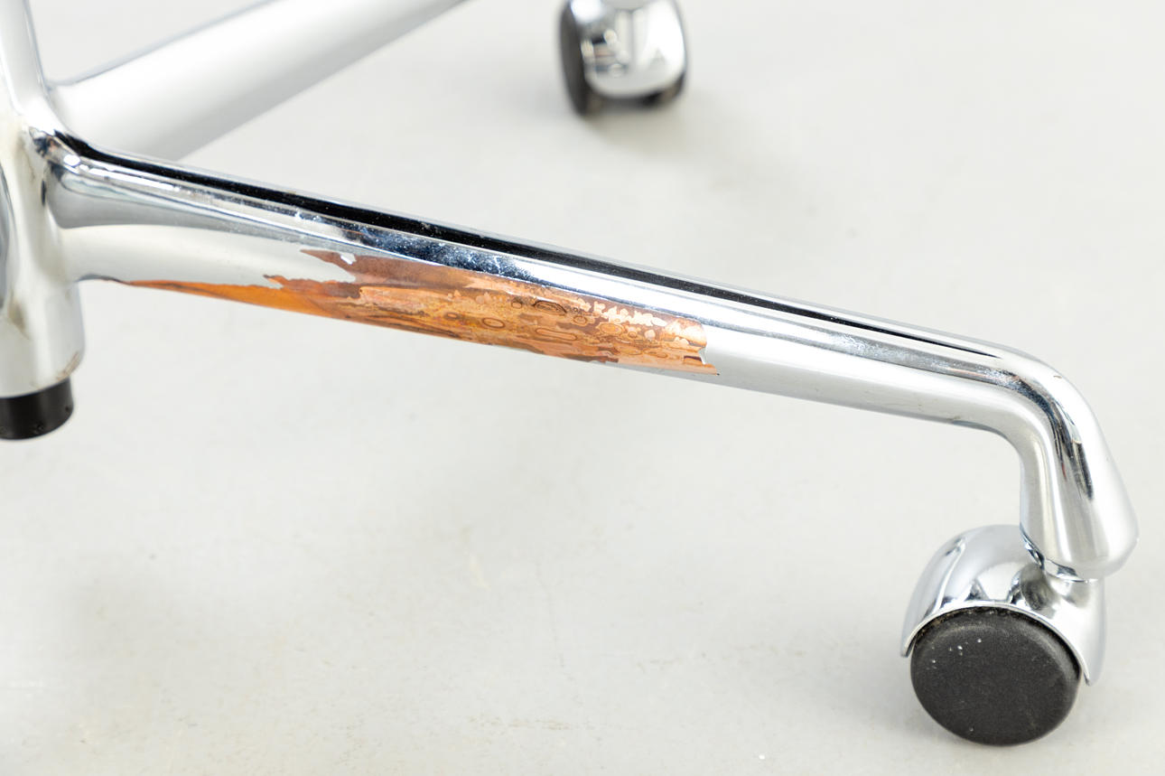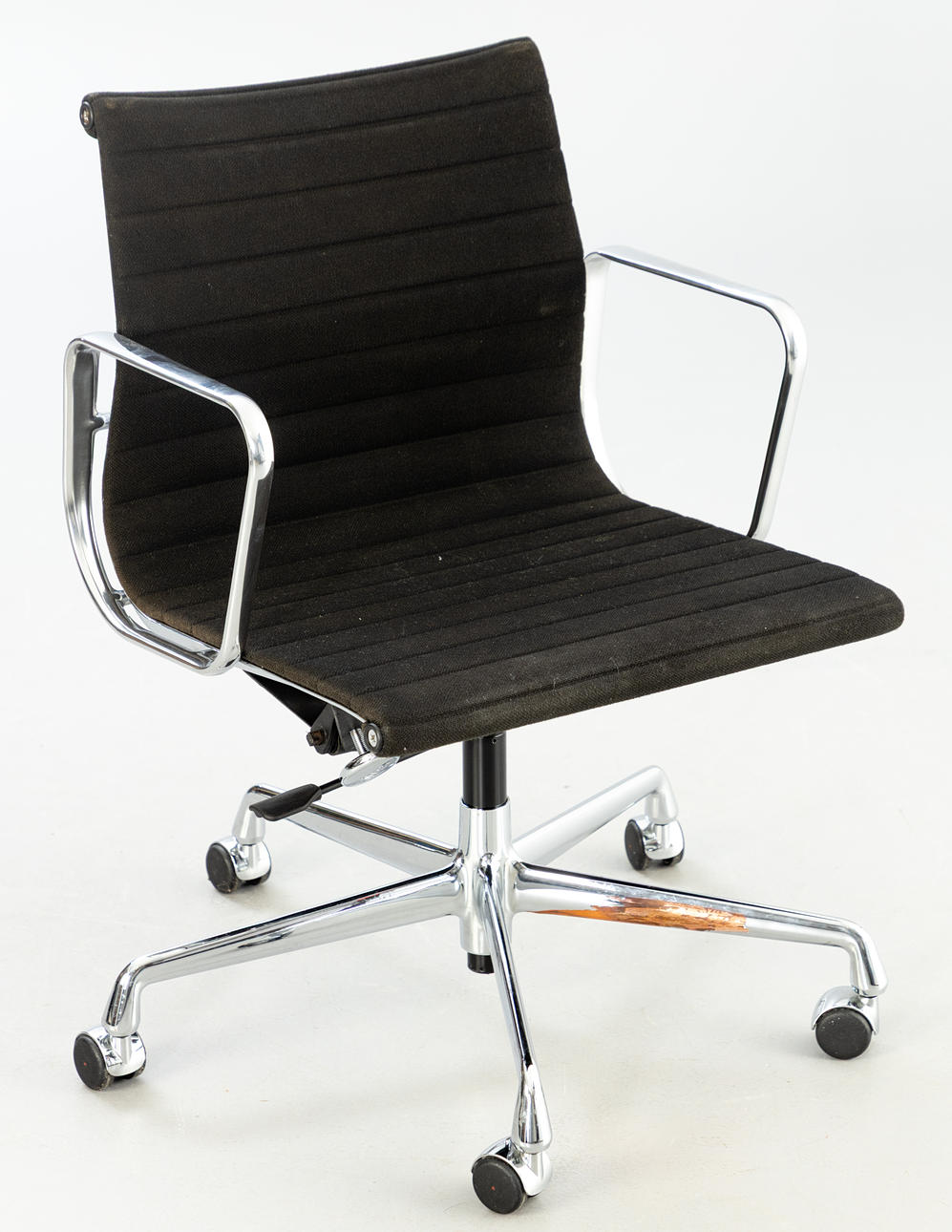 Vitra. 'EA 117' kontorstol af Ray & Charles Eames. Design: 1958. Udførelse med hopsak-dæksel og forkromet aluminiumsramme. Drejeligt 5-stjernet fod på hjul, højdejusterbar og med vippefunktion. Indskrevet med etiket.
