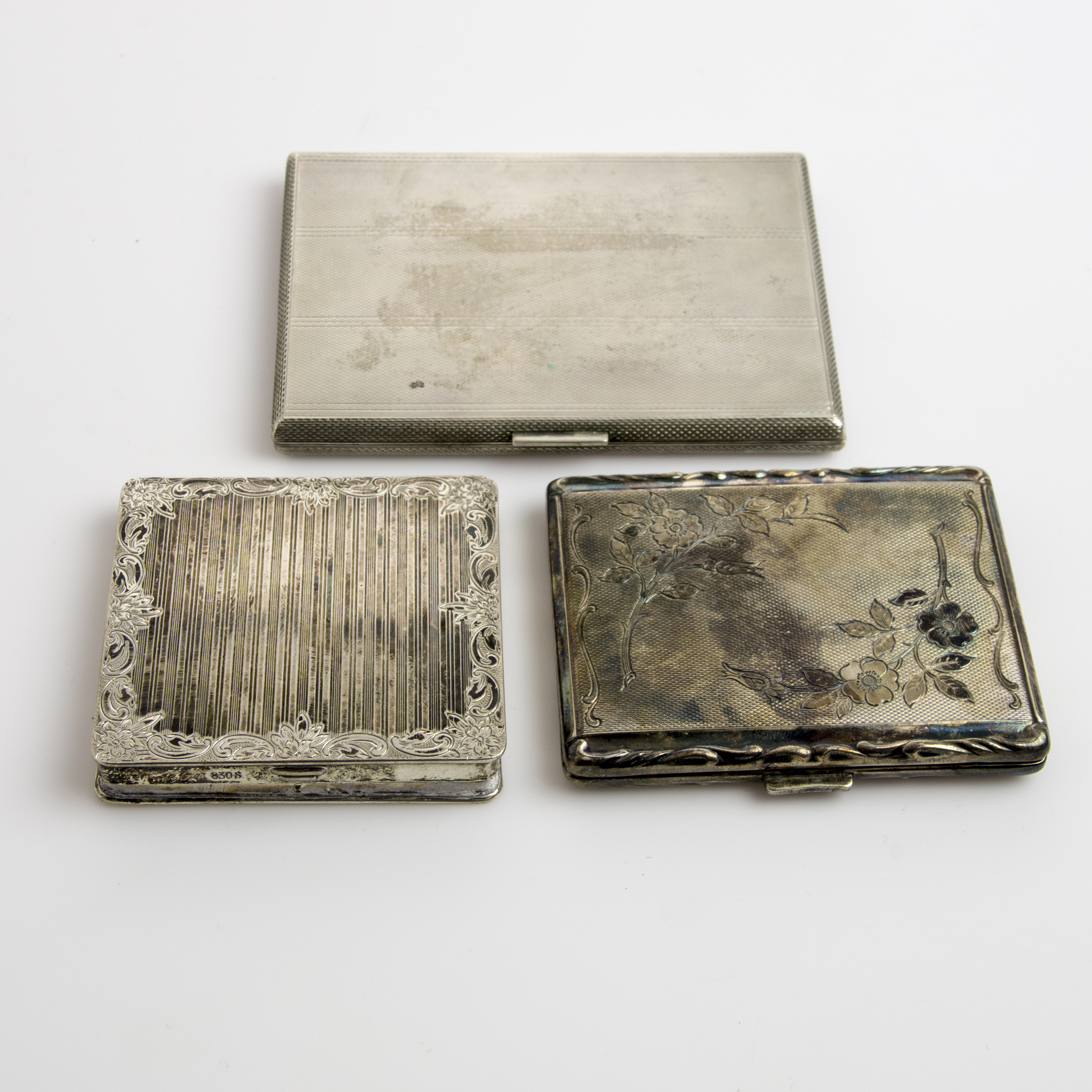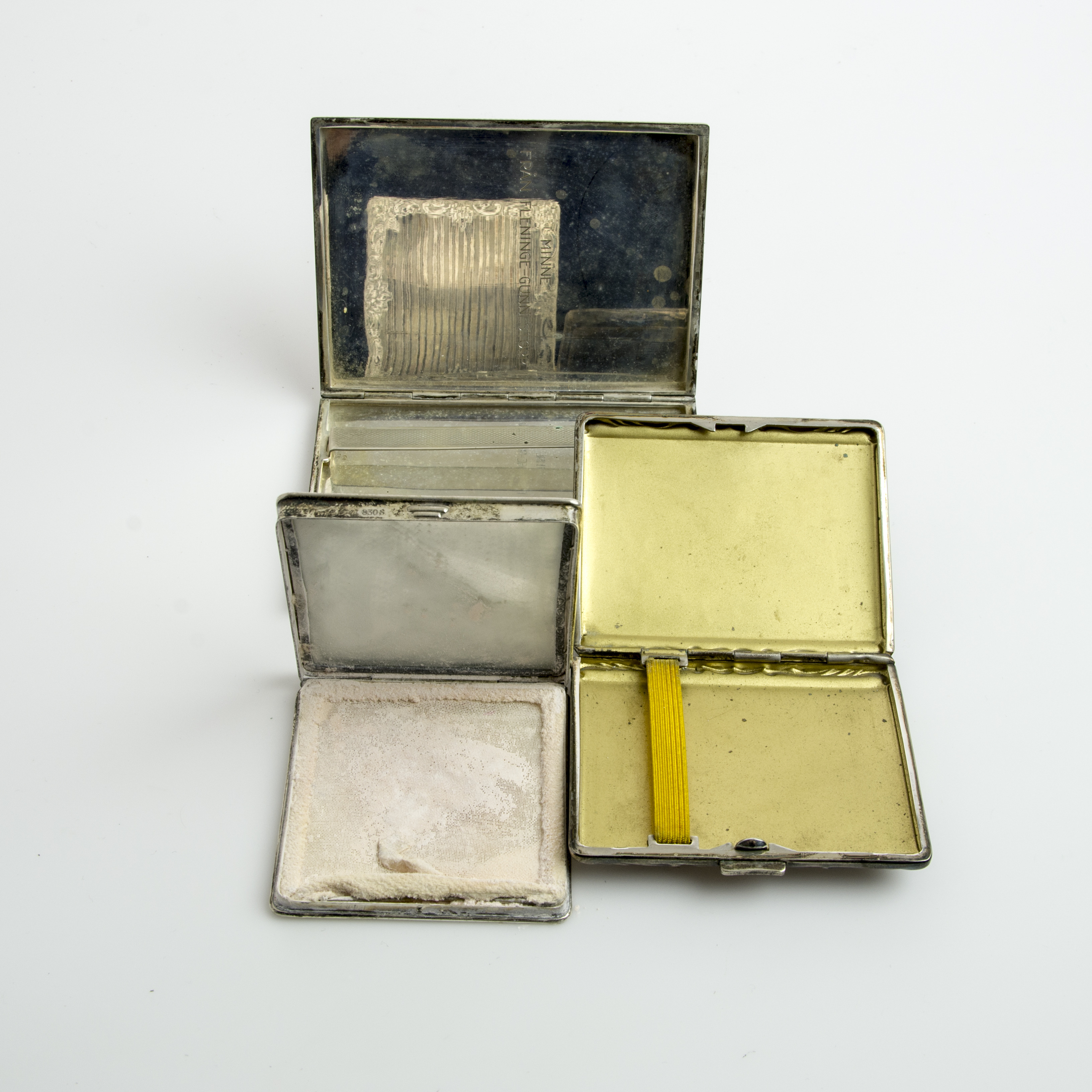 440574. PULVERÆSKE OG 2 CIGARETETUIER, sølv.