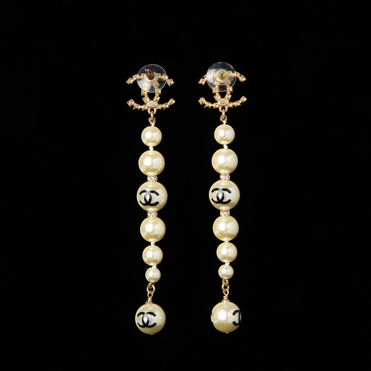 Imiterede perler med CC-logo og logo med sten lavet af rhinestones.