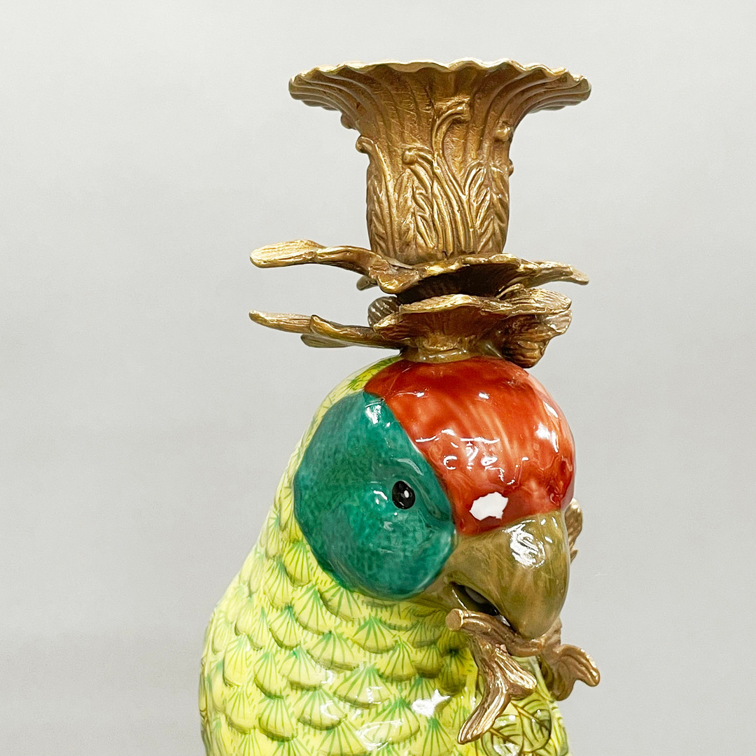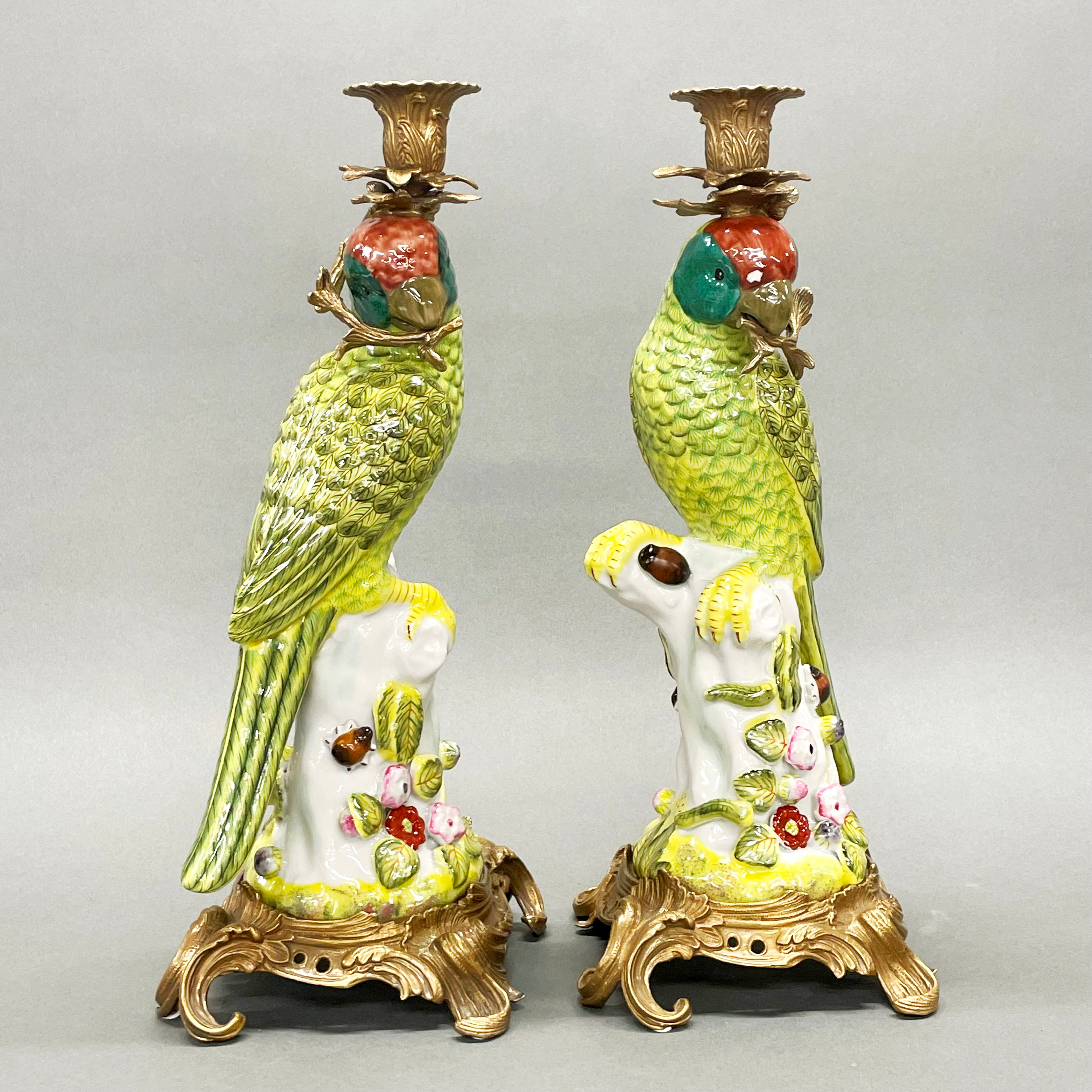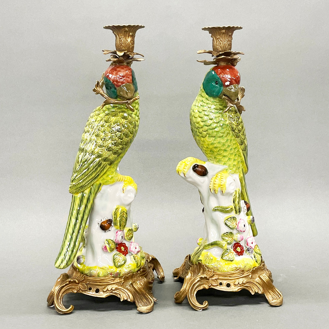 4412829. PAR ORMOLU & PORCELÆN PAPEGØJE LYSESTAGER.