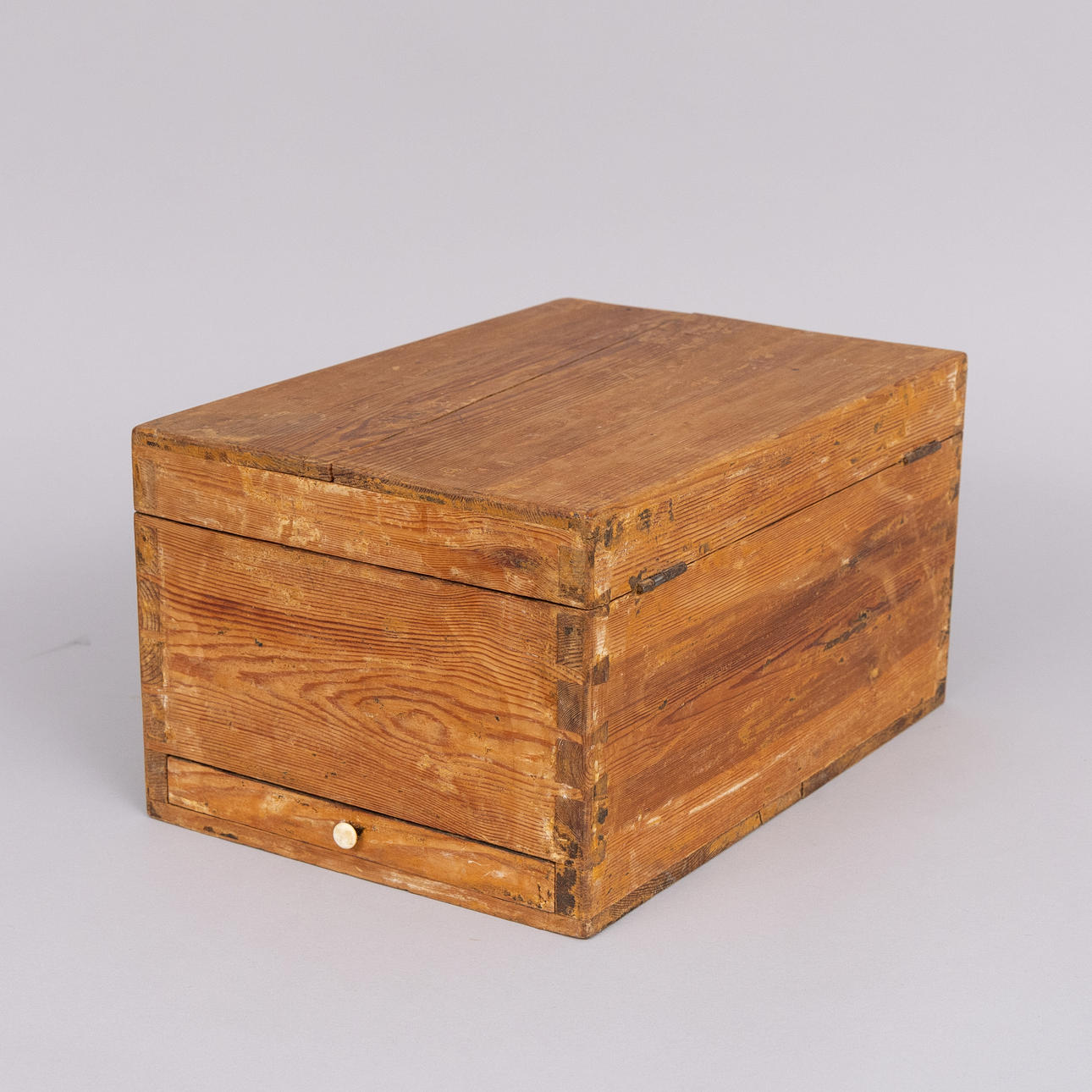 Sukkertop, i æske med kniv. Kasse i fyrretræ.