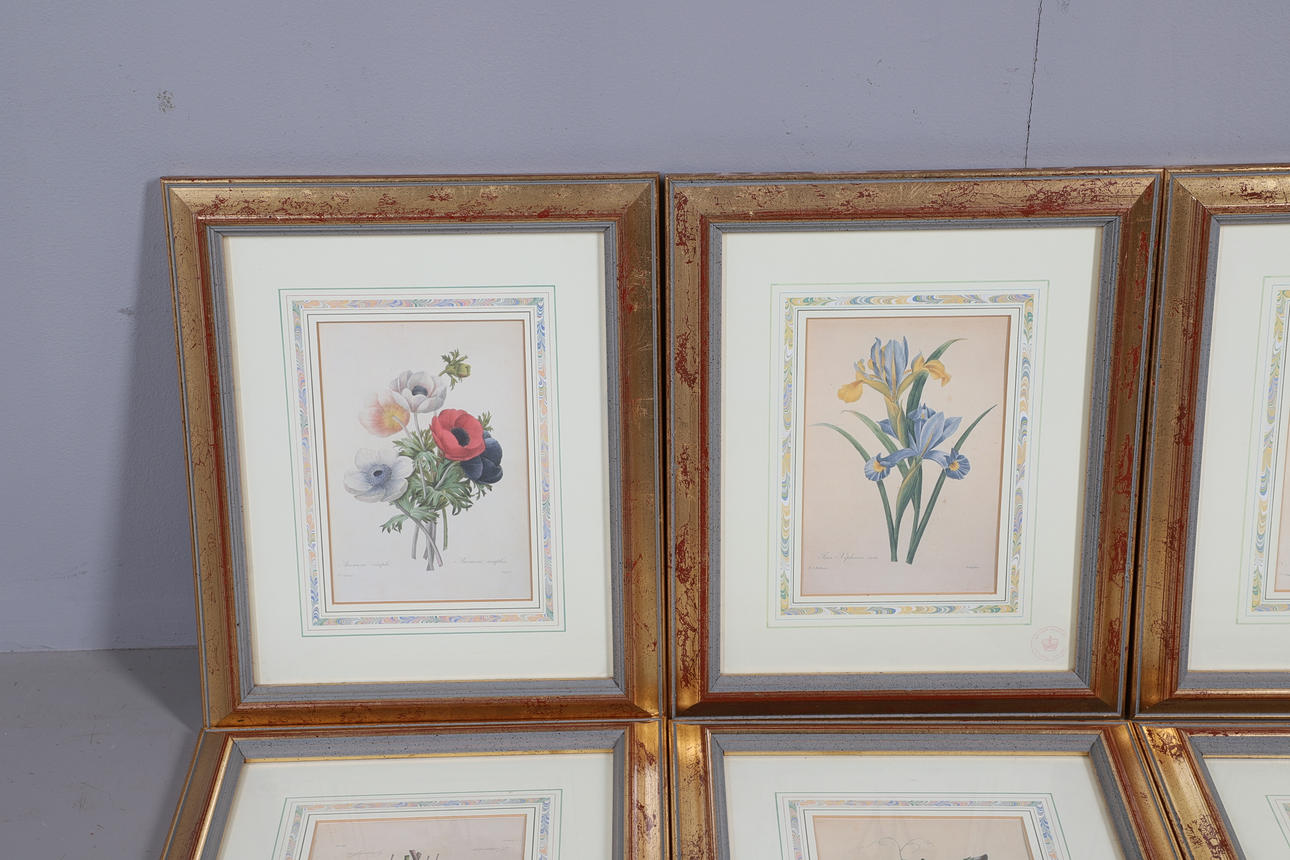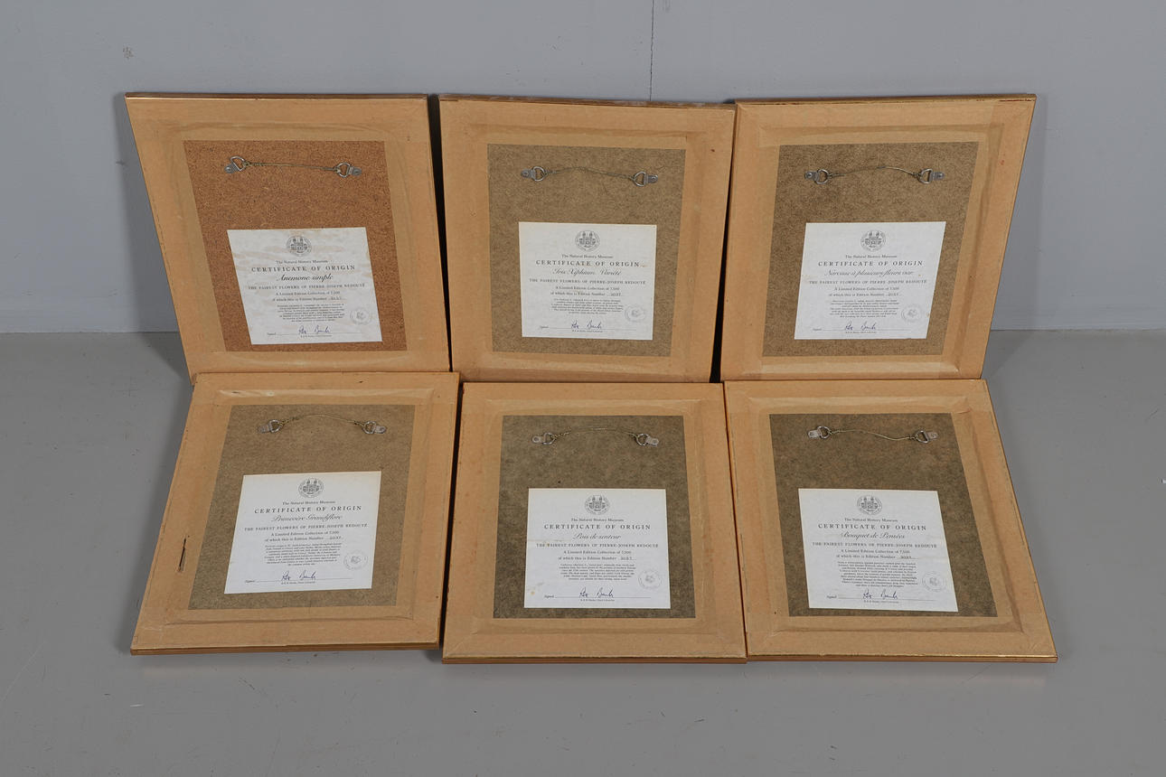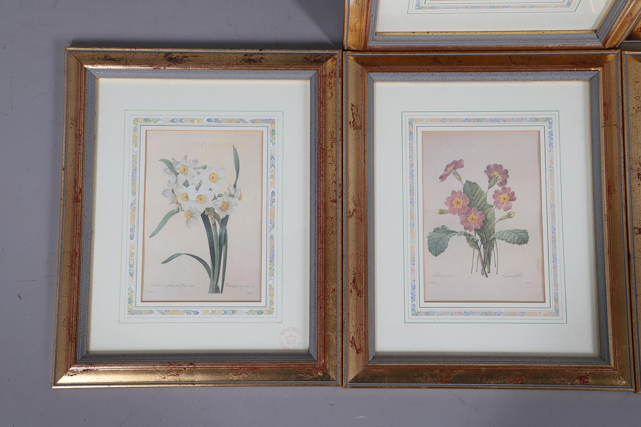 Et sæt af 6 moderne indrammede botaniske tryk, taget fra designs efter Pierre Joseph Redoute, indrammet og med certifikater. Rammer 37 cm x 31 cm. (6).
