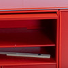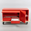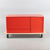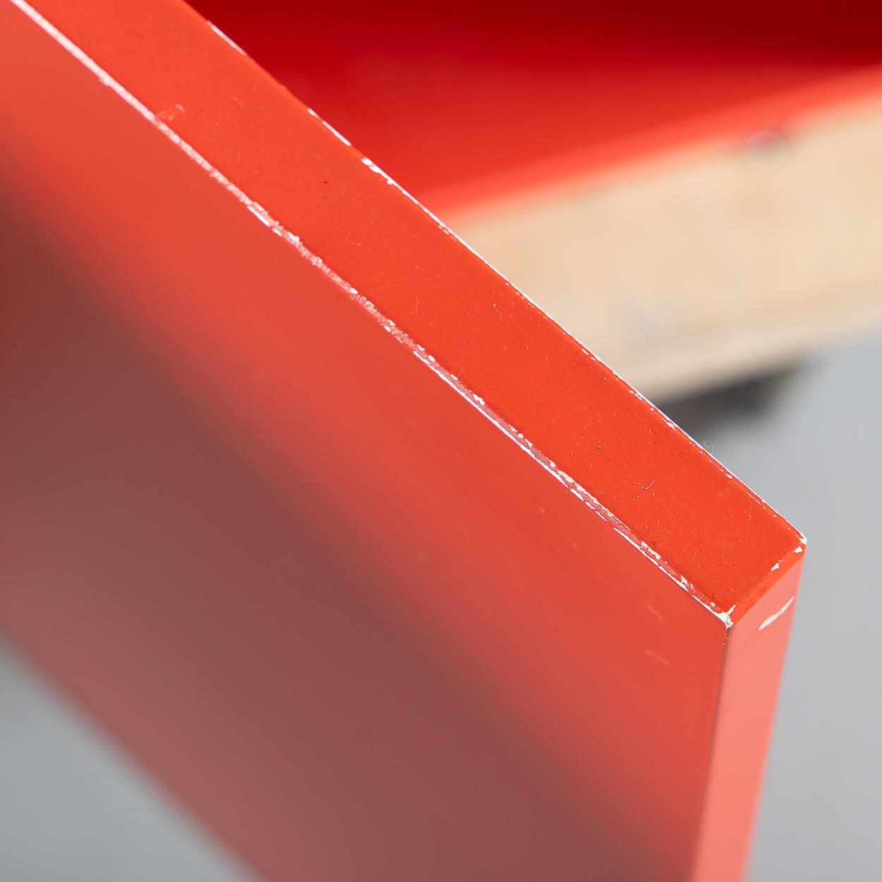 Rødlakeret mdf, løs glasplade, højde ca. 48, 105 x 38 cm.