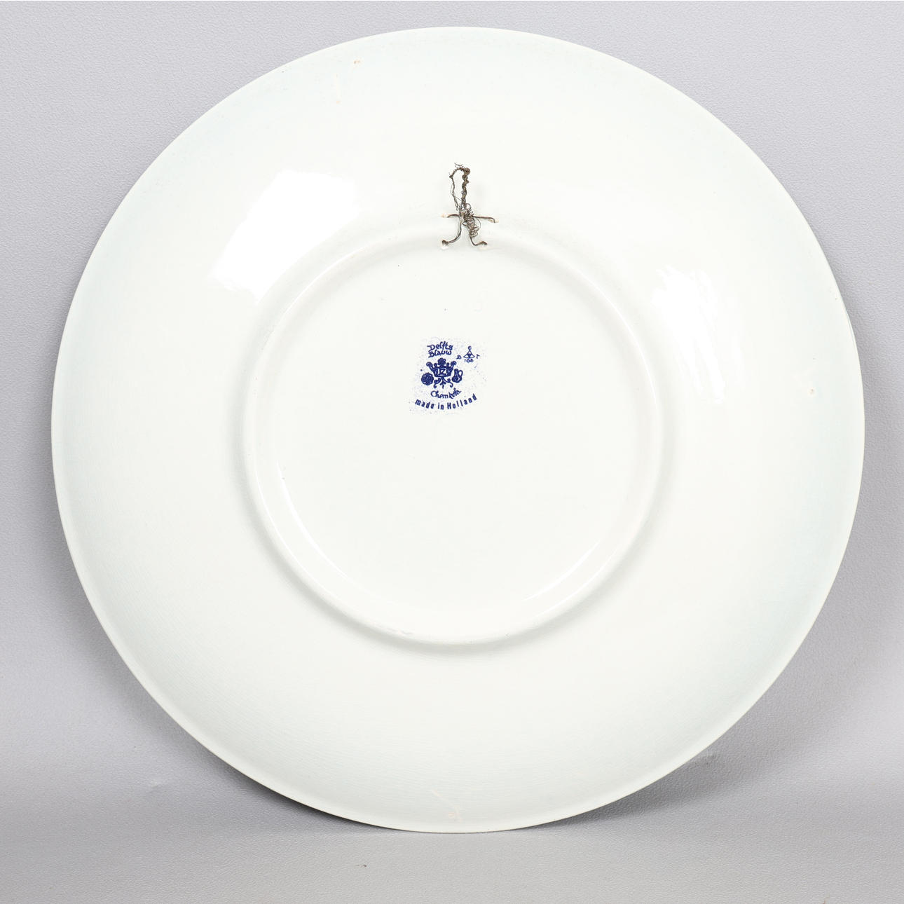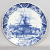 dekoreret med figurer foran en vindmølle, inden for en bladkartouche kant, blåt trykt delftmærke nedenunder, 39 cm diameter.