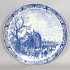 dekoreret med en vinterskøjteløbsscene, inden for en lotusrullekant, blåt trykt delftmærke nedenunder, 39 cm diameter.