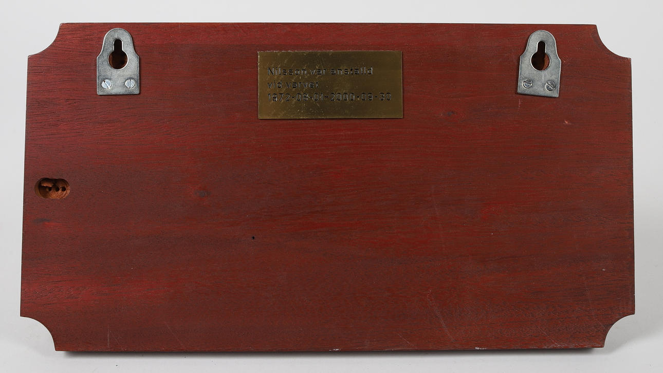 Indskrift: Rosenholmsvarvets store tak til Nils-Erik Nilsson. Dimensioner ca.: 37x20 cm.