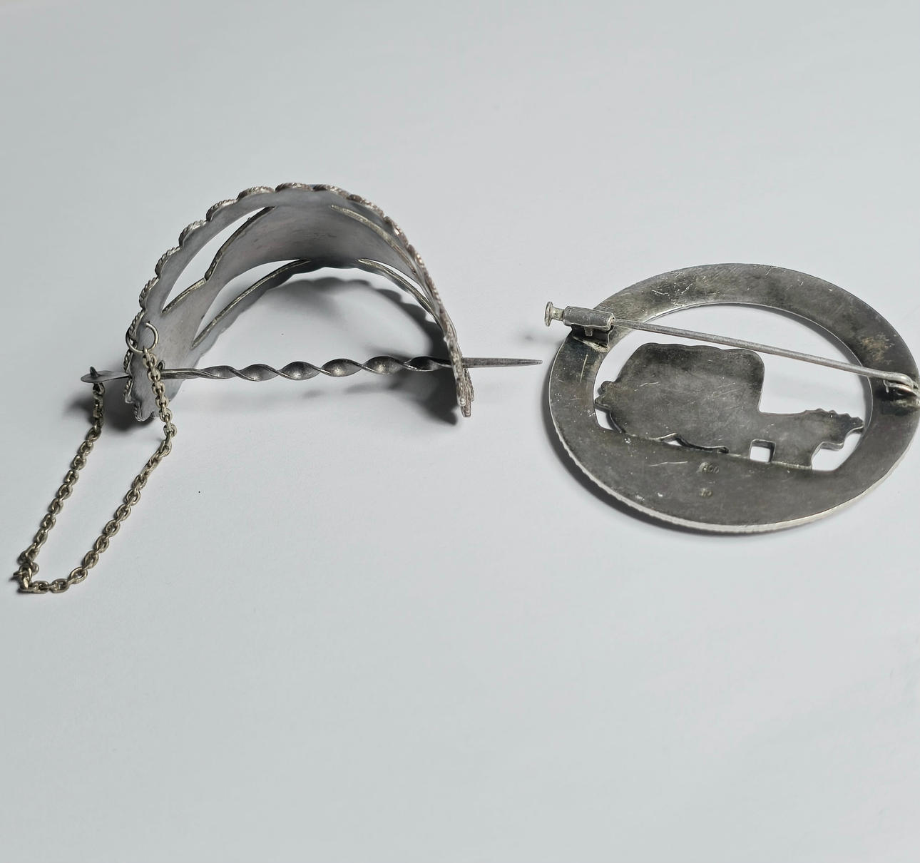 SØLV BROCHE OG GAFFEL MED GULDUDSIGT.