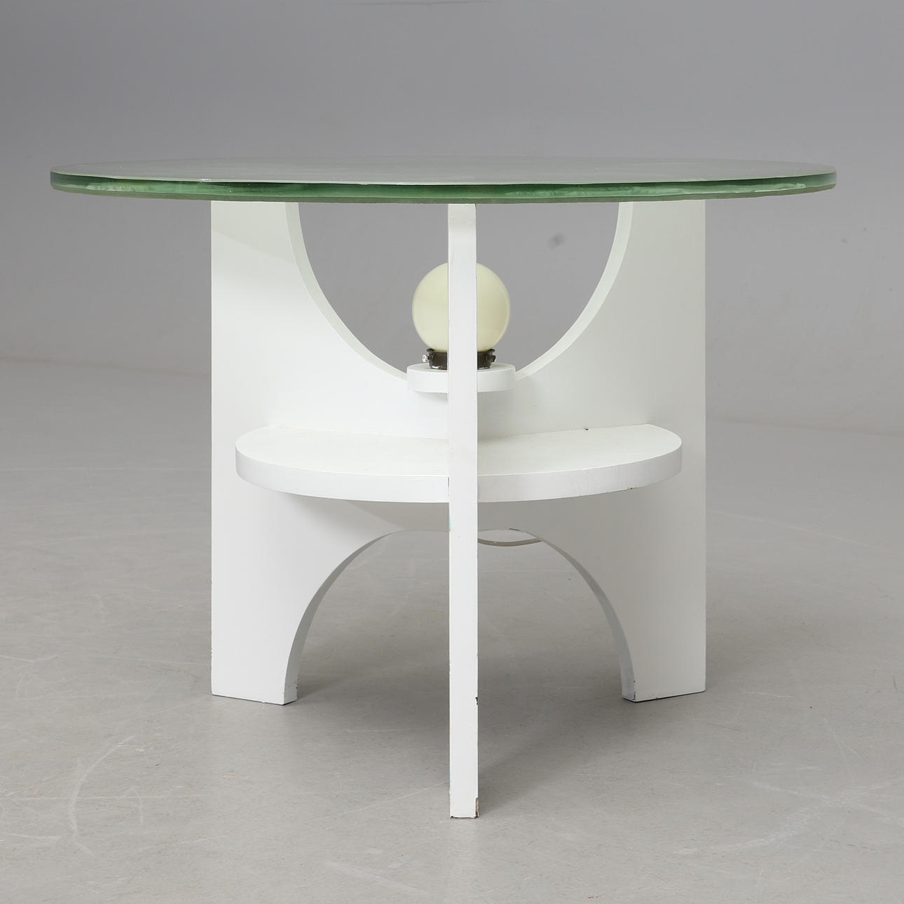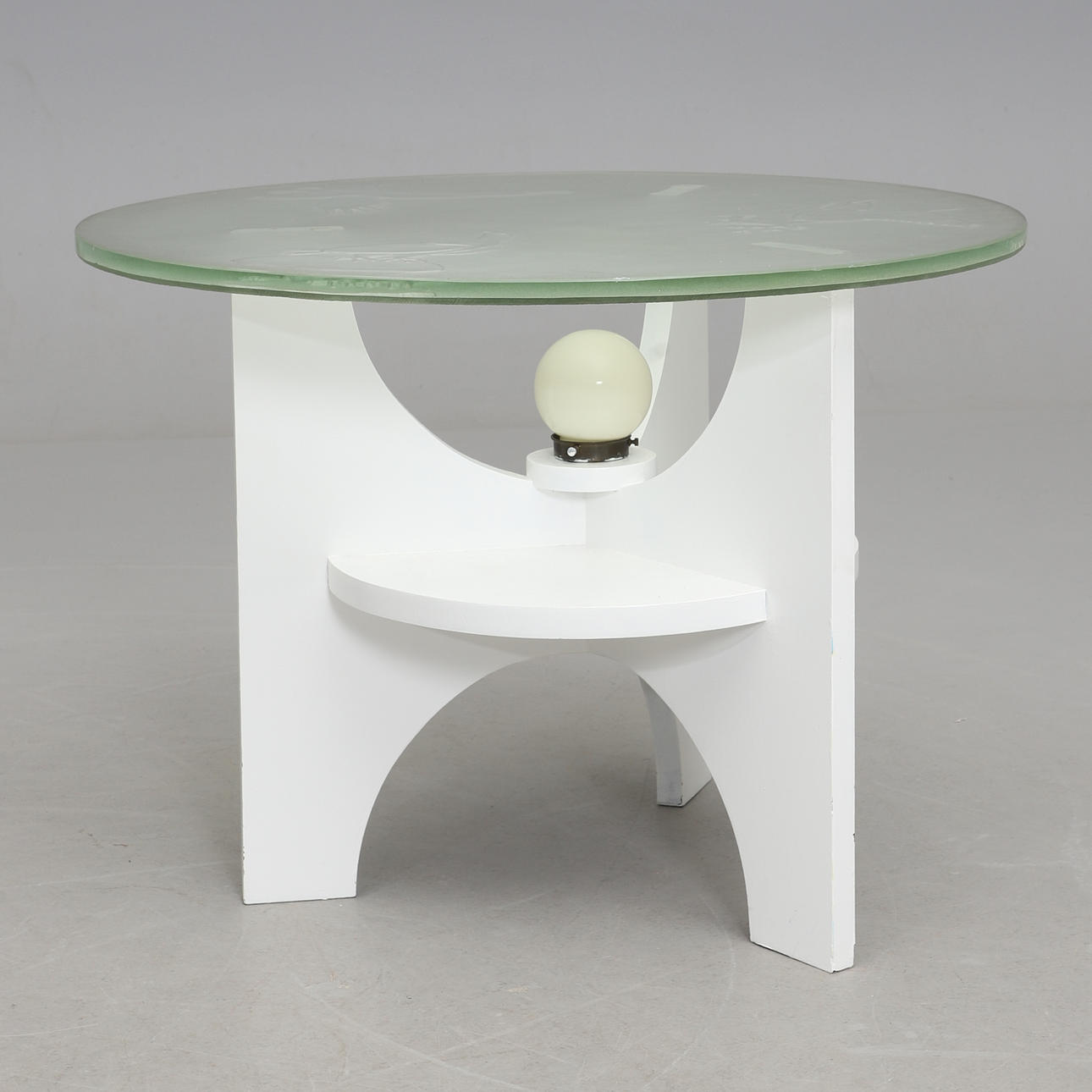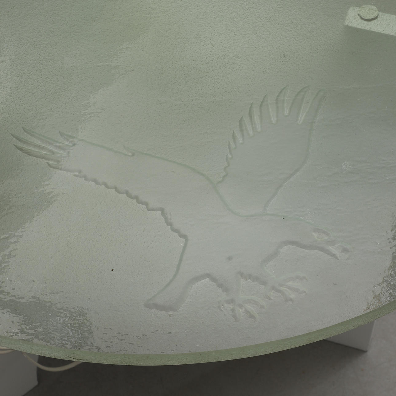 Hvidlakeret benstativ med hylde og belysning, rund skive i råglas med skåret dekoration af rovfugle. Diam 79, højde 57 cm.