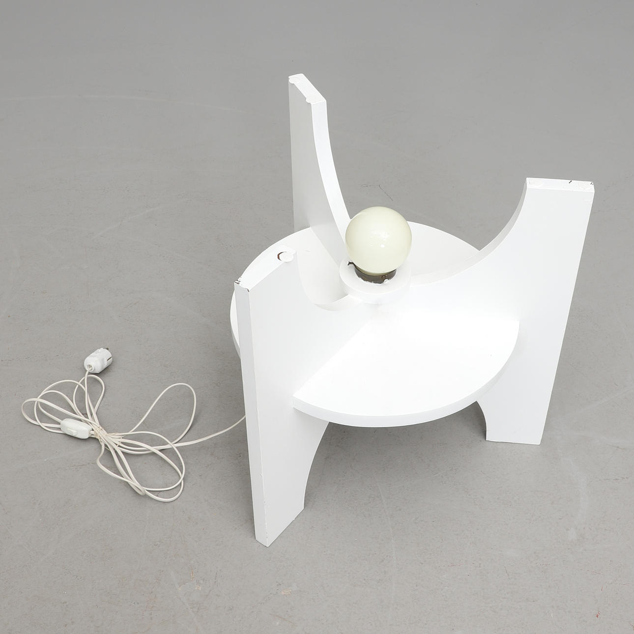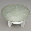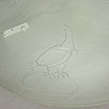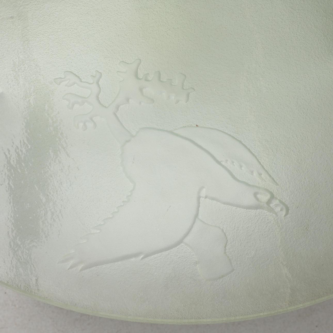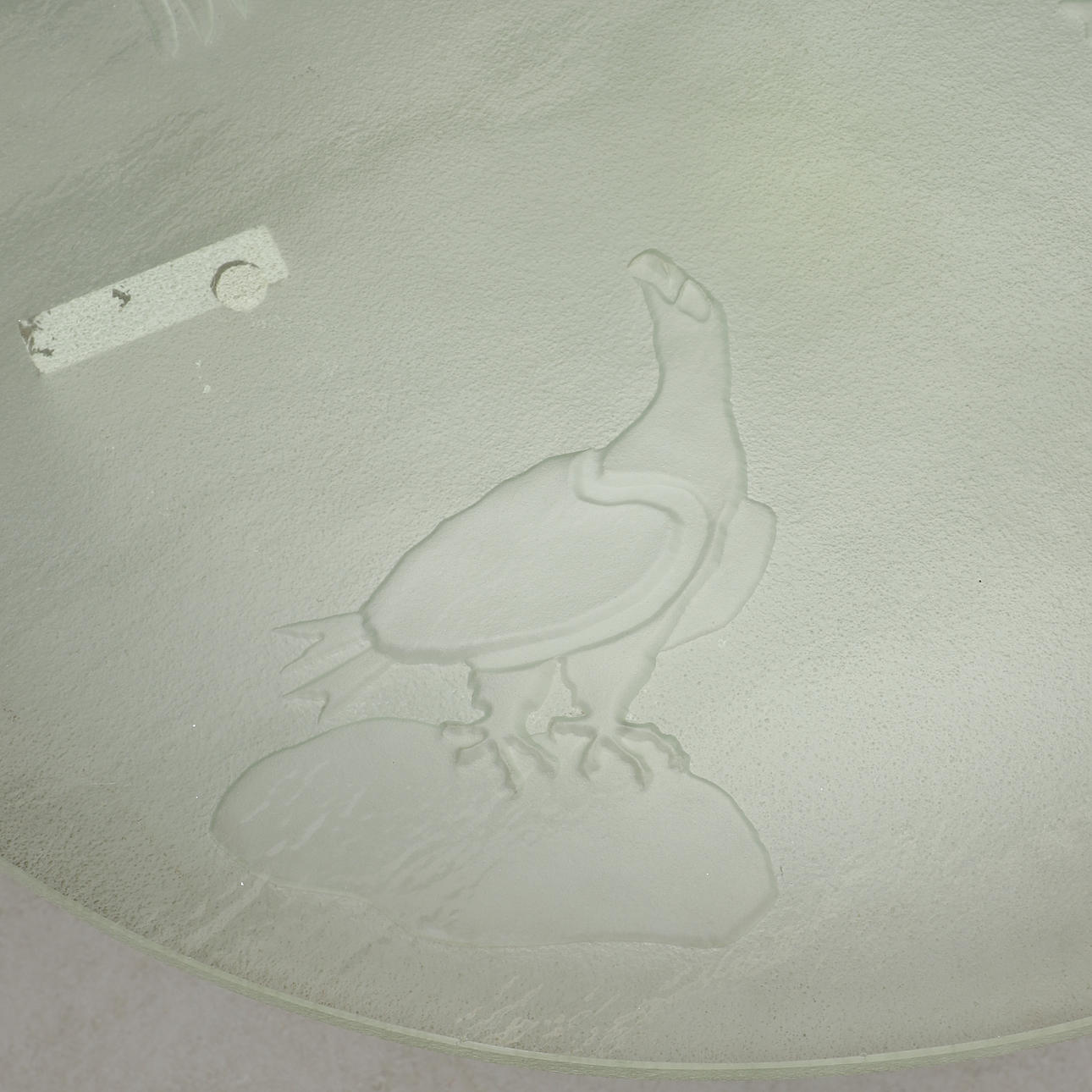 Hvidlakeret benstativ med hylde og belysning, rund skive i råglas med skåret dekoration af rovfugle. Diam 79, højde 57 cm.