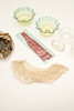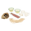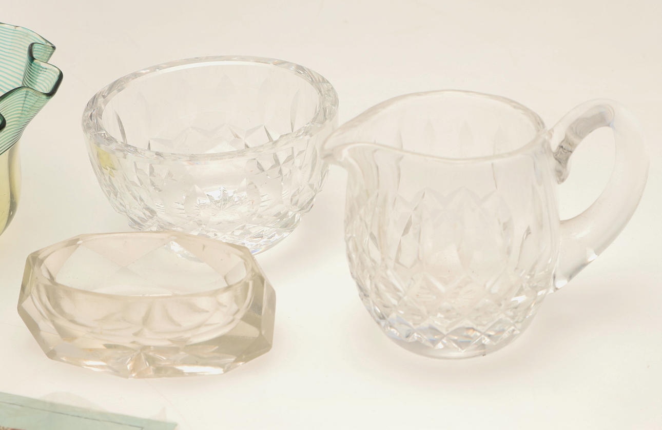 Inkluder et par formede farvede glasskåle (højde 6 cm x diameter 12,5 cm), andet glas, en pose vintage kugler og andre genstande. Se venligst online billeder.