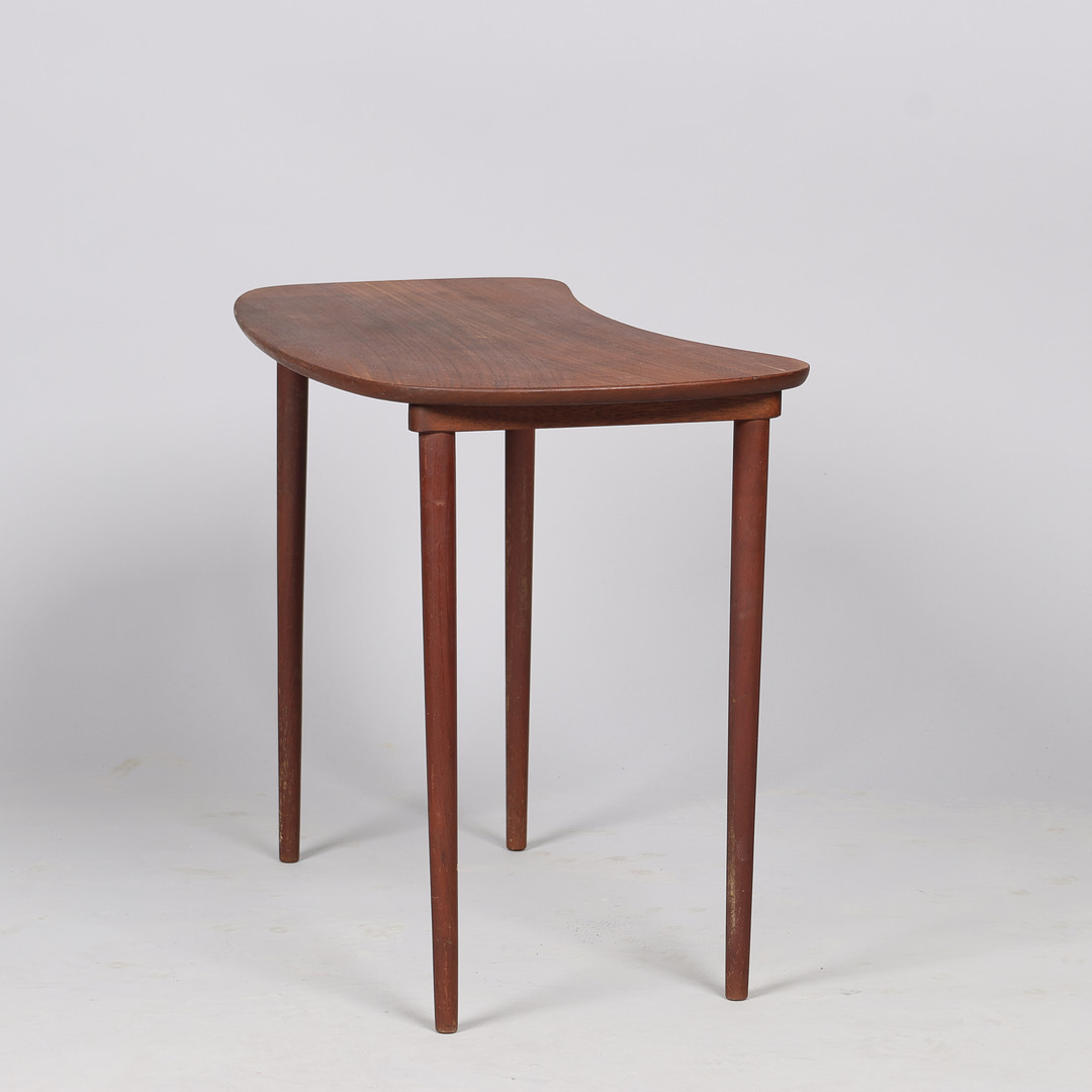 4451034. Lille sidebord af teaktræ på tynde koniske ben.