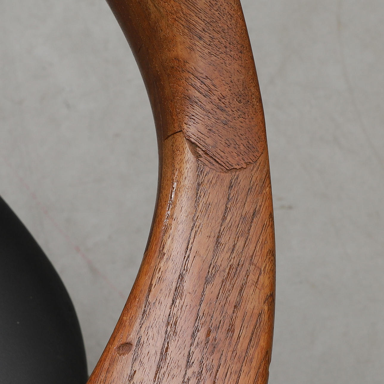 Det er teak. Sæde betrukket med sort kunstlæder. Bredde 59, dybde ca. 50, ryghøjde 72,5, sædehøjde 42 cm.