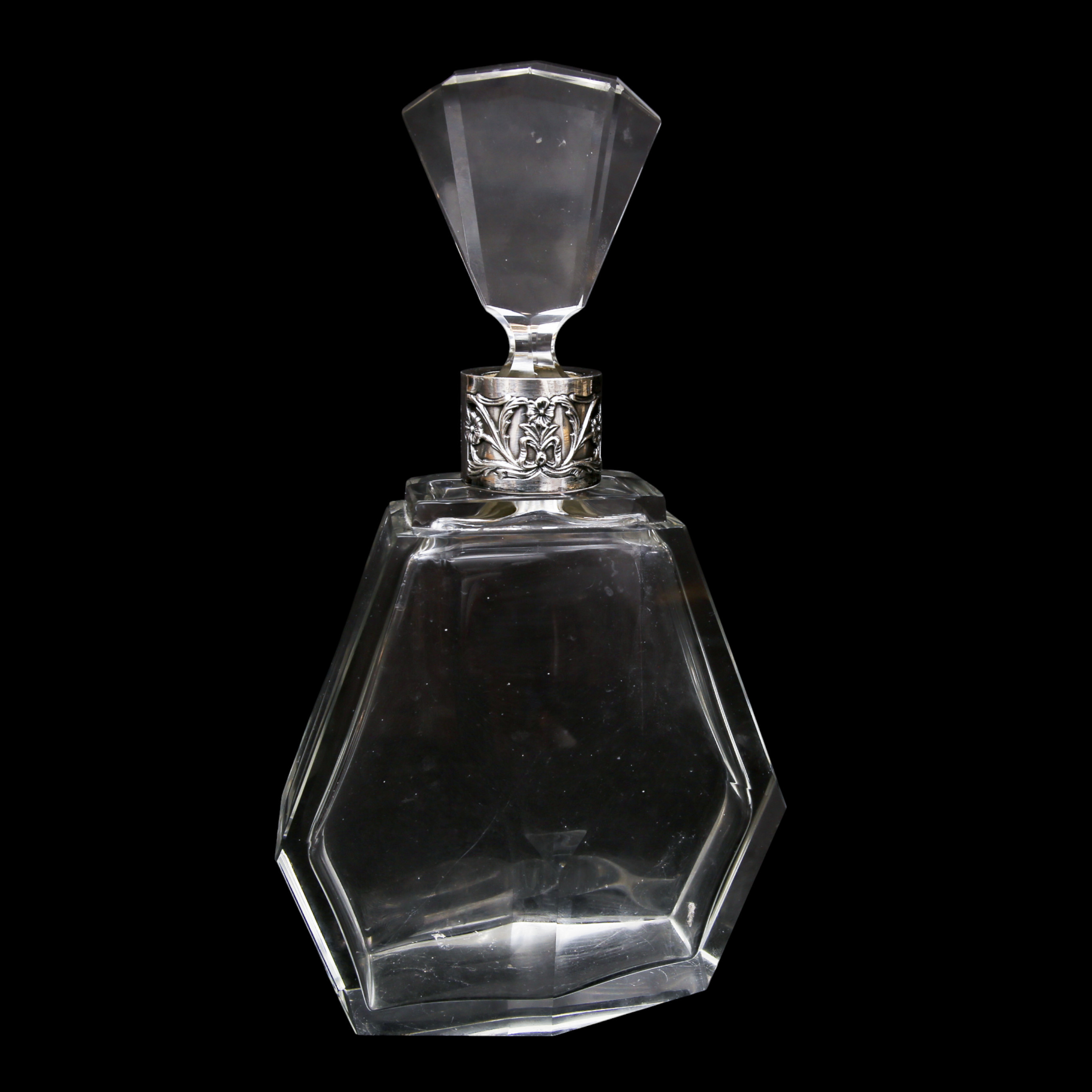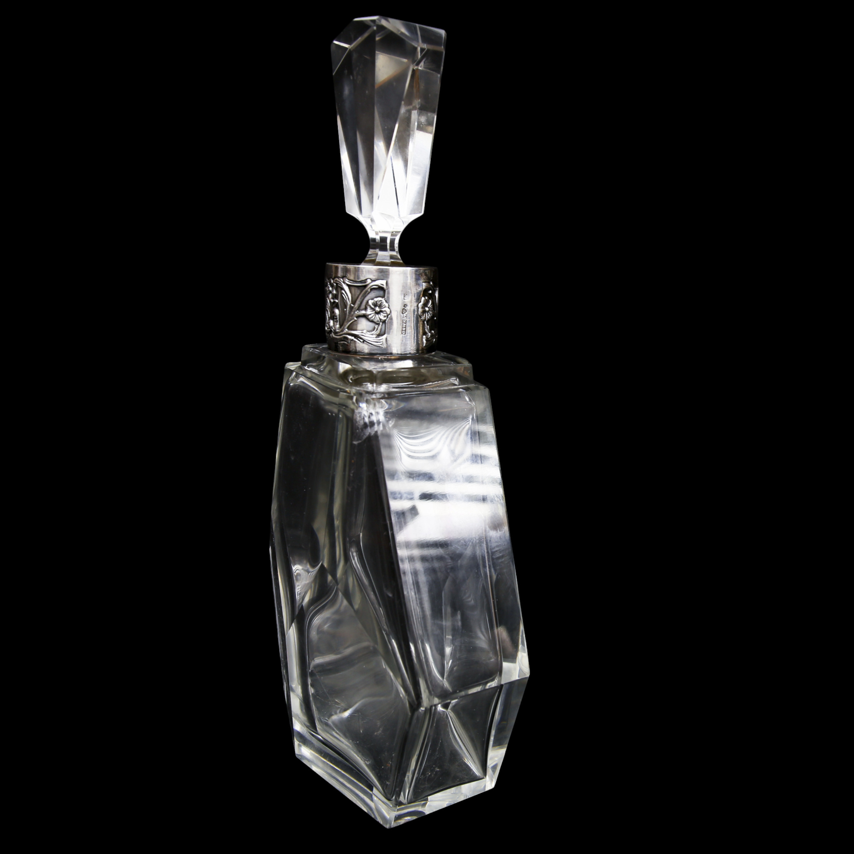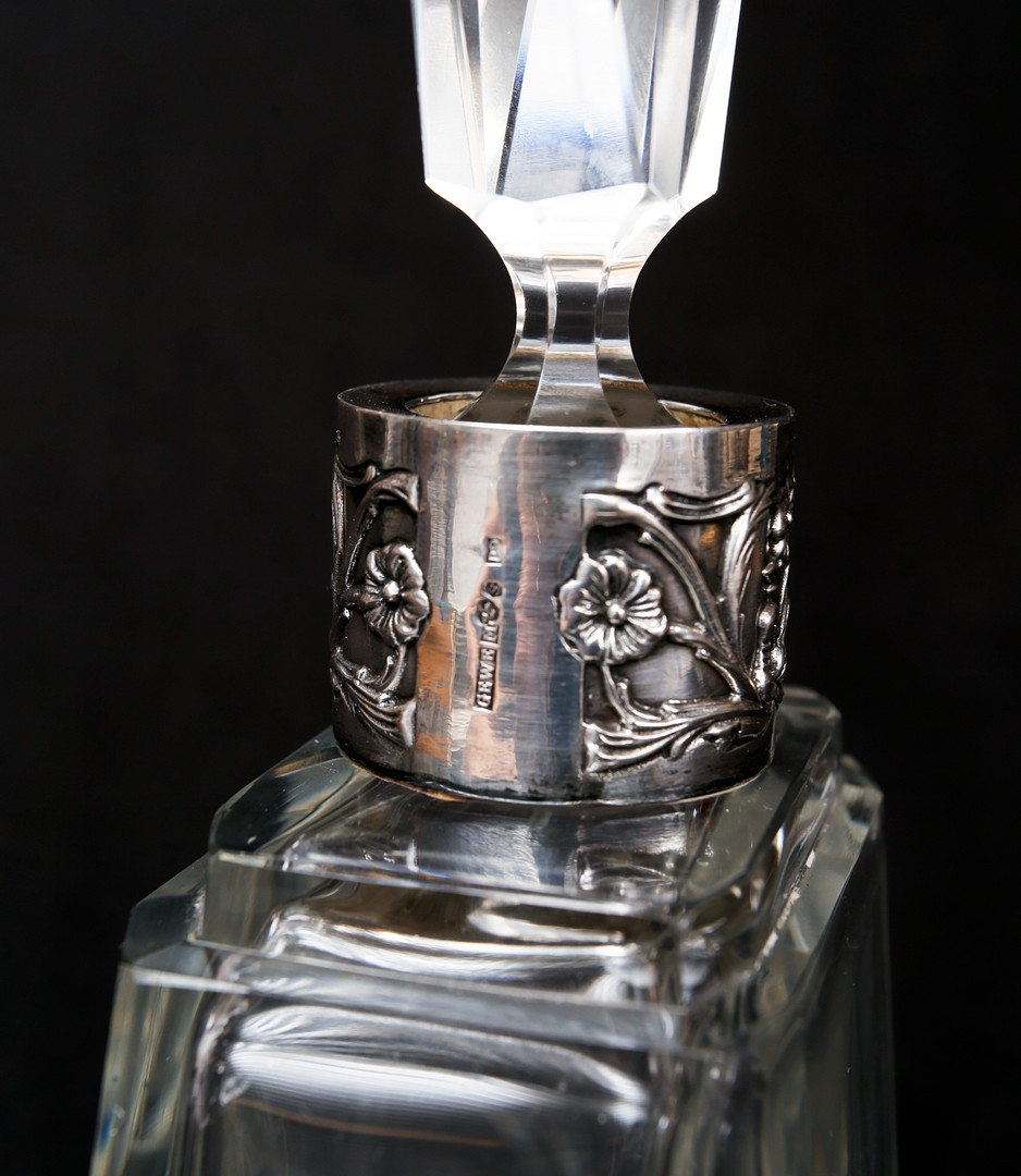 4462555. KARAFFEL MED PROP, GLAS, sølvmontering med blomsterdekoration.