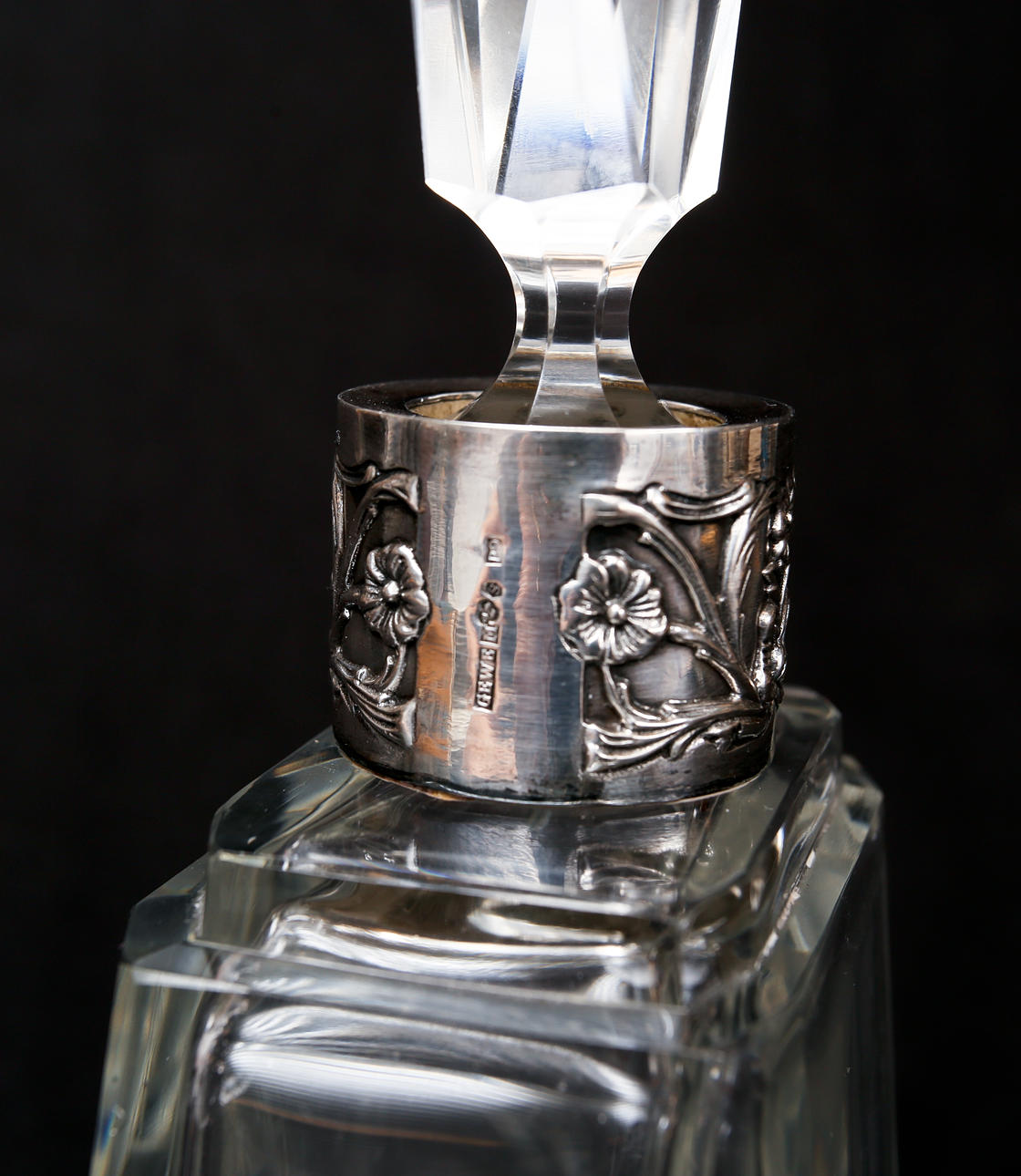 4462555. KARAFFEL MED PROP, GLAS, sølvmontering med blomsterdekoration.