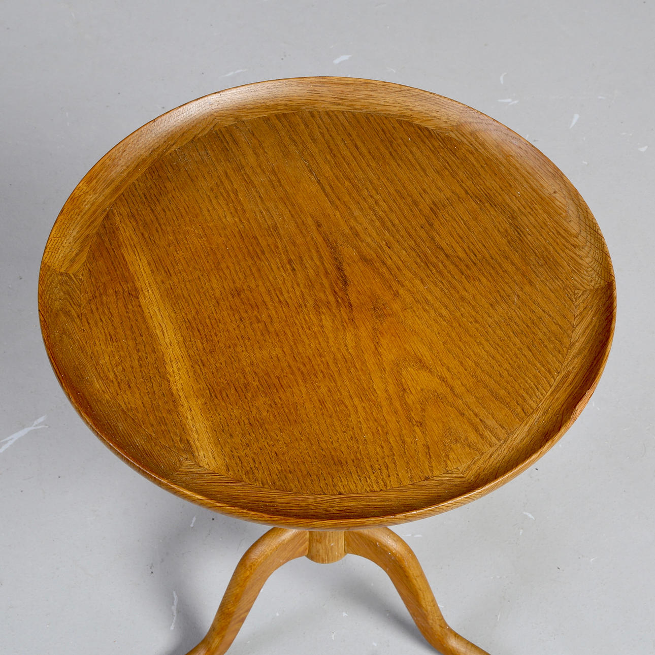 Lampebord af massivt egetræ, drejet stamme afsluttet på trepasfod. Fremstillet hos Anton Kildeberg, 1960'erne. H. 52, Ø 43 cm.