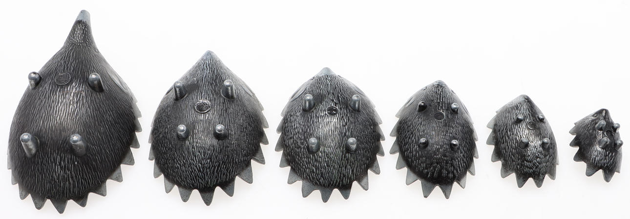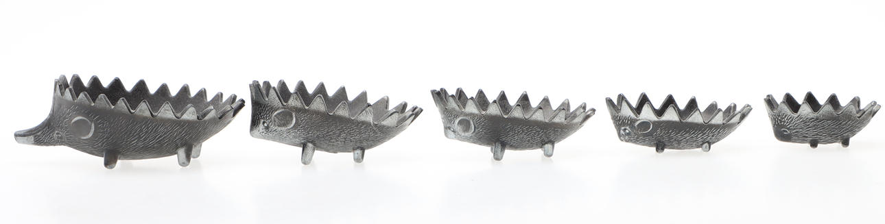 ASKEBÆGER, 6 stk, Pindsvin, metal, stabelbart, efter Walter Bosse.