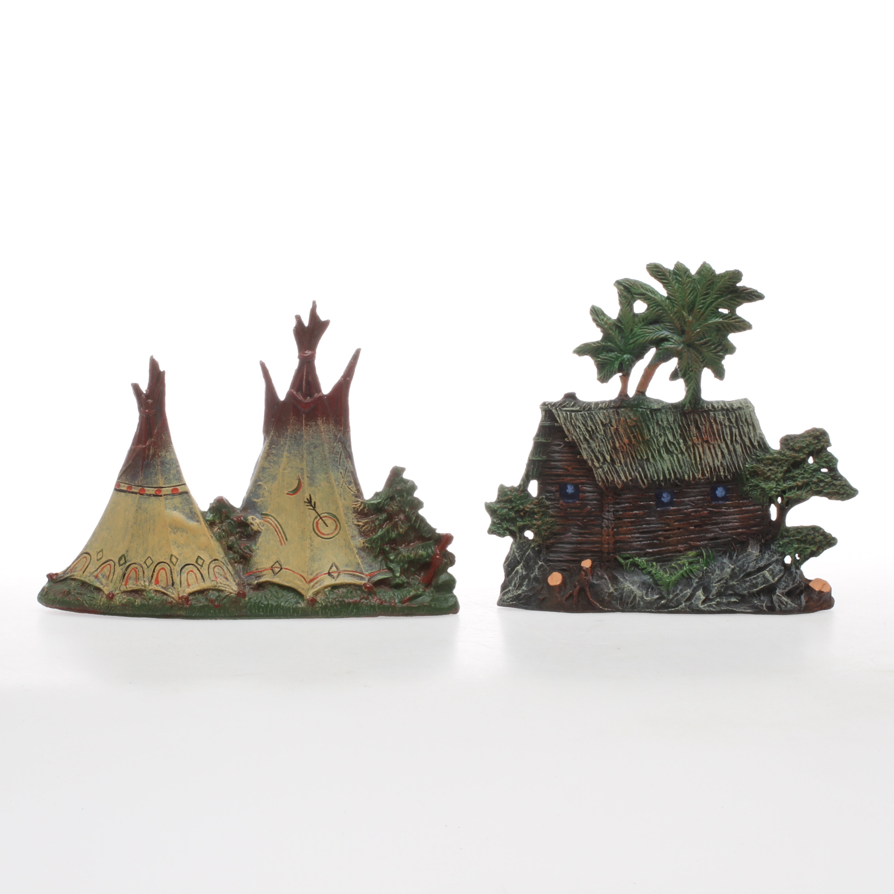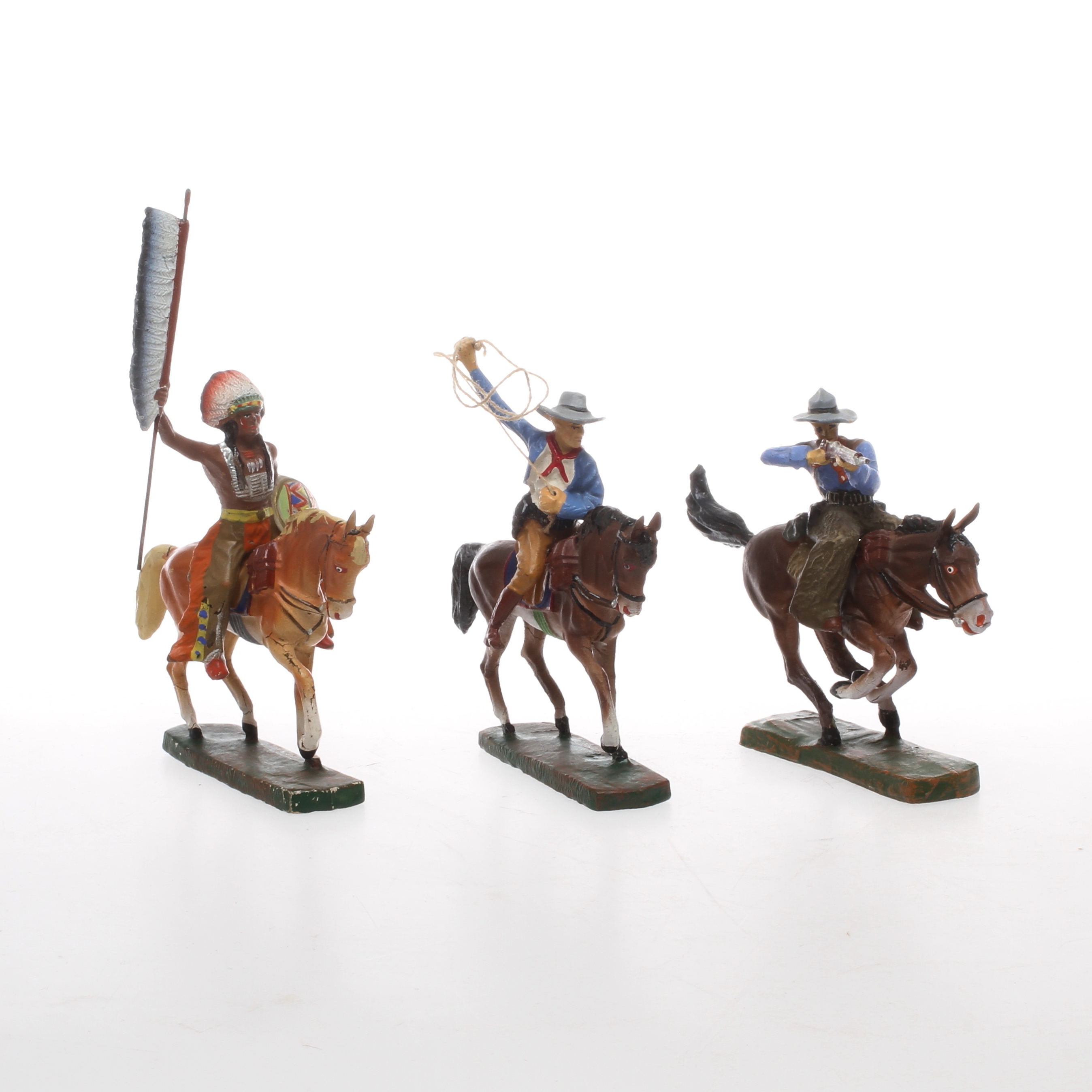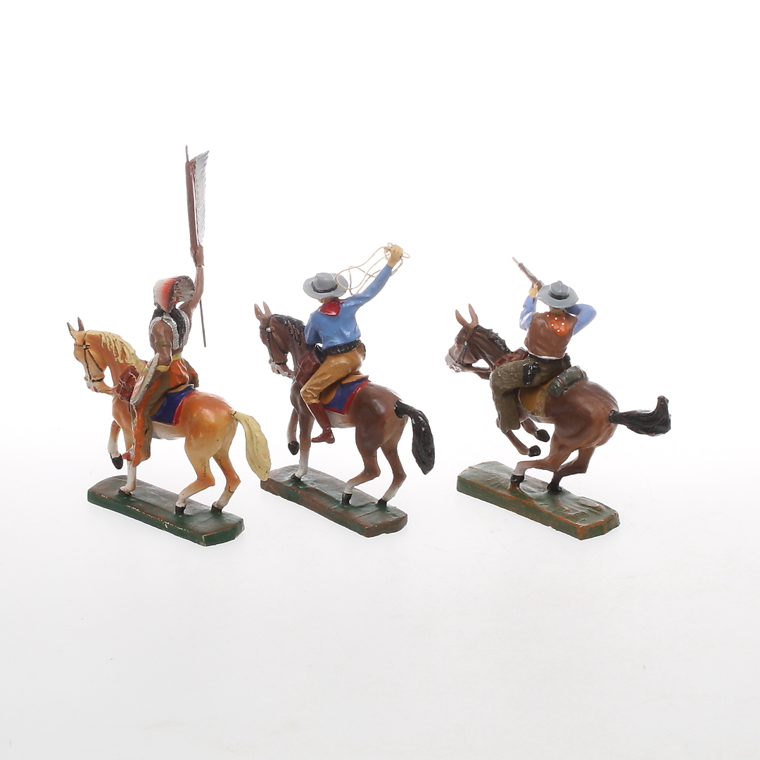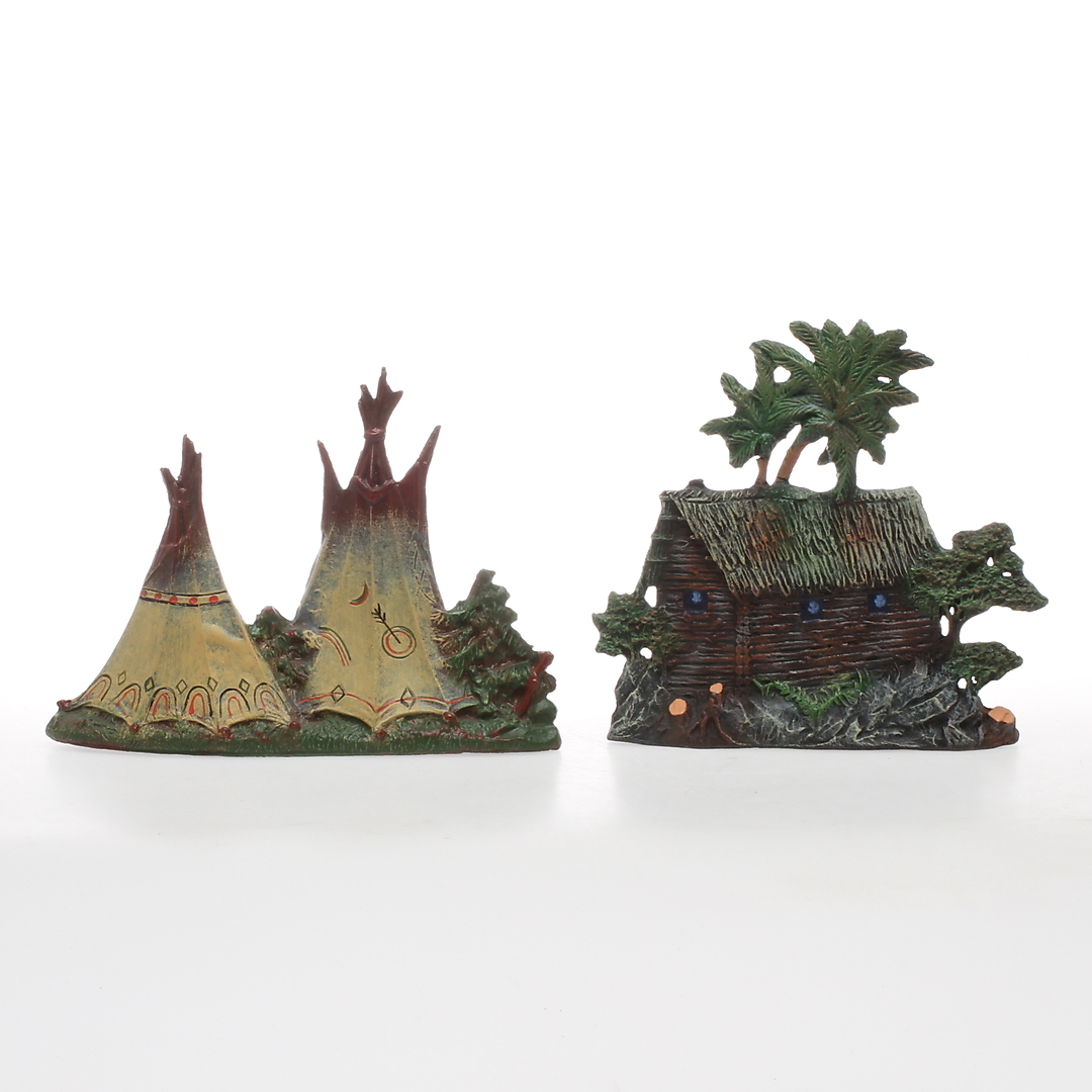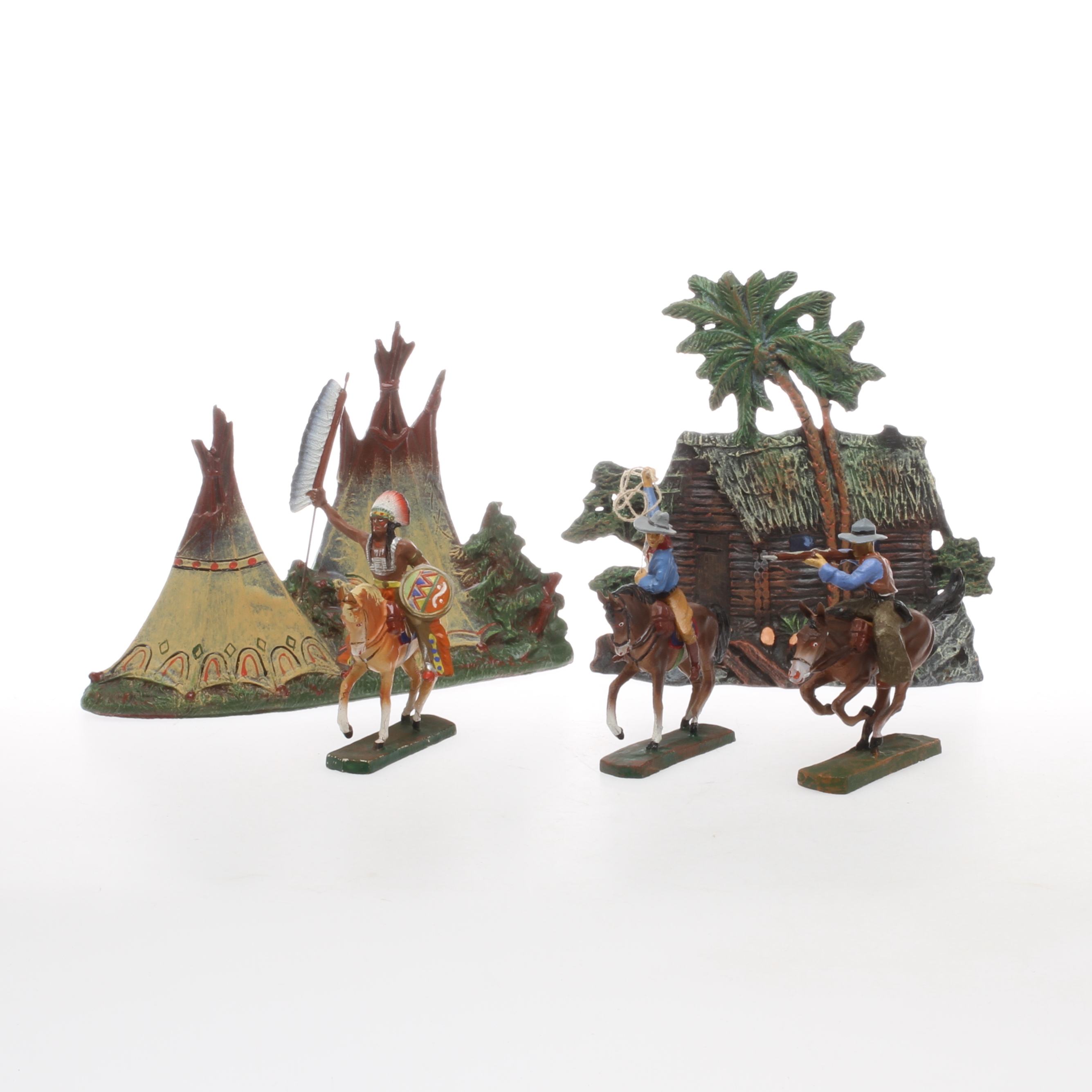 447882. ELASTOLIN dobbelttelt, bjælkehus og tre ryttere til hest.