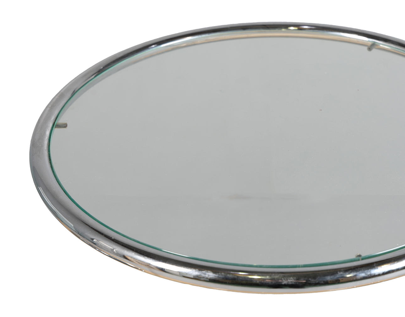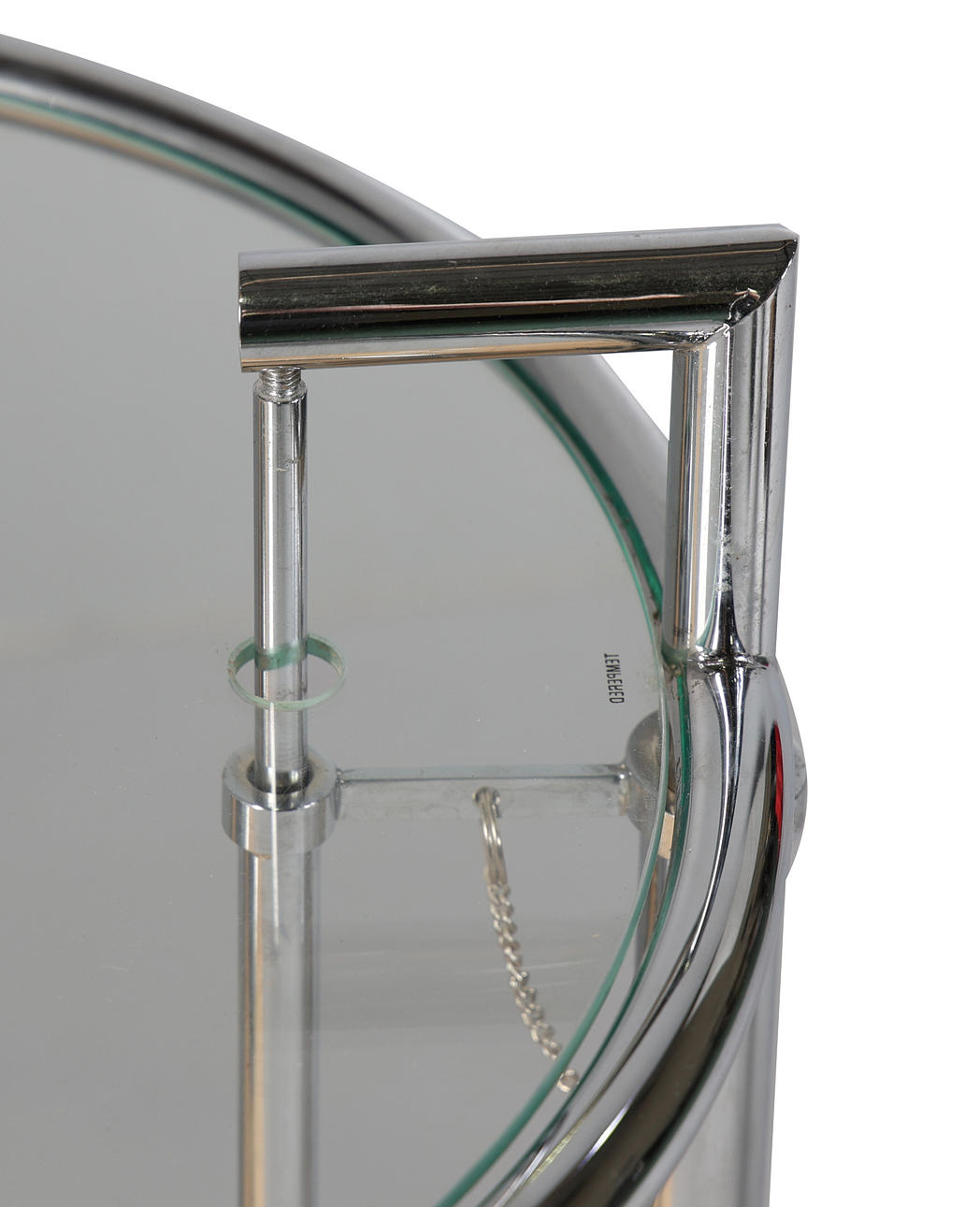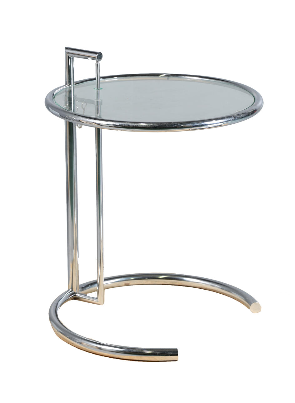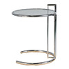Det italienske fremstillede justerbare sidebord i stil med Eileen Gray, forkromet ramme med cirkulær hærdet glasplade, 64 cm højde, 51 cm diameter på toppen.