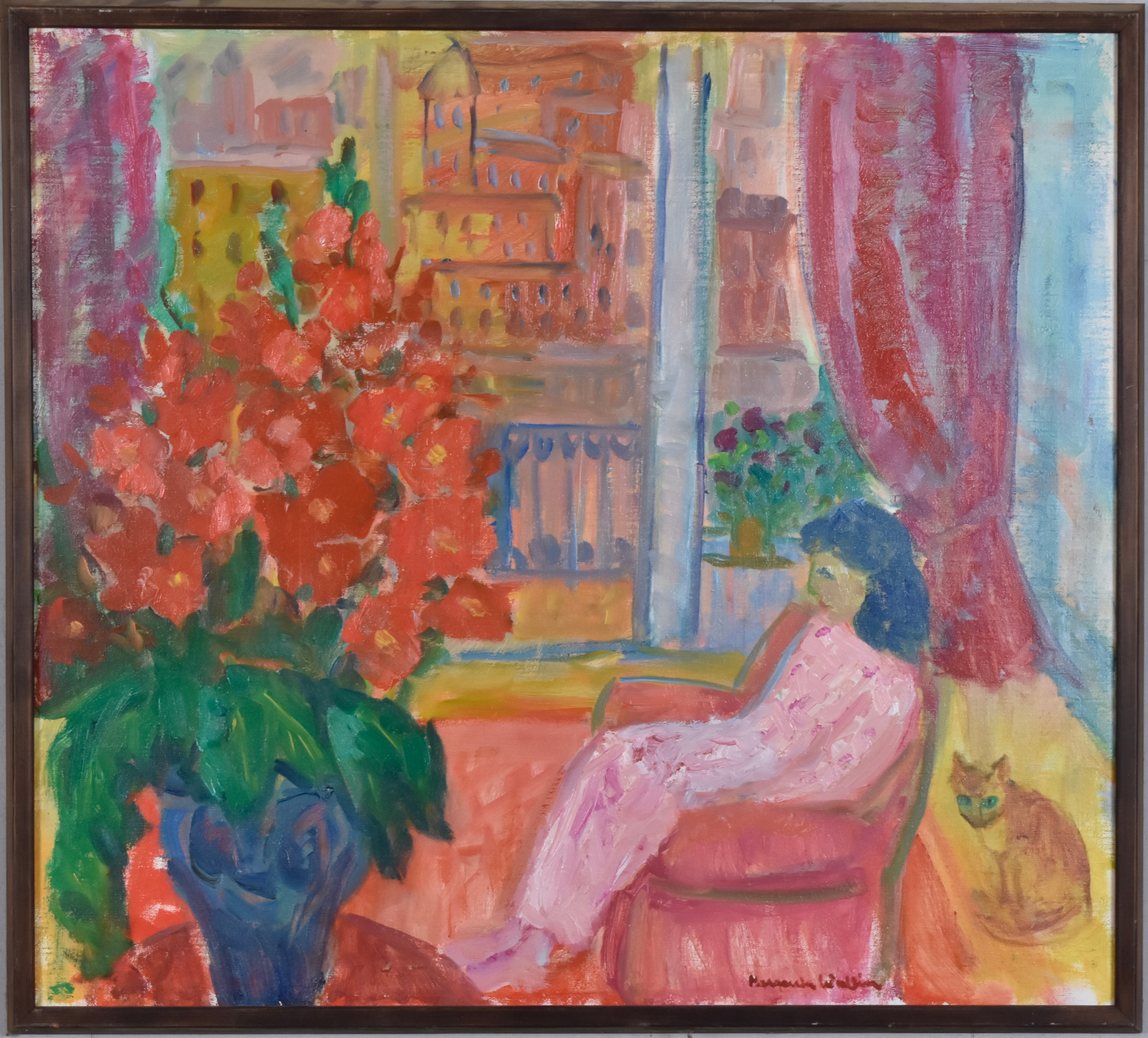 4481332. MARGARETA WALLIN. oliemaleri, interiør med kvinde.