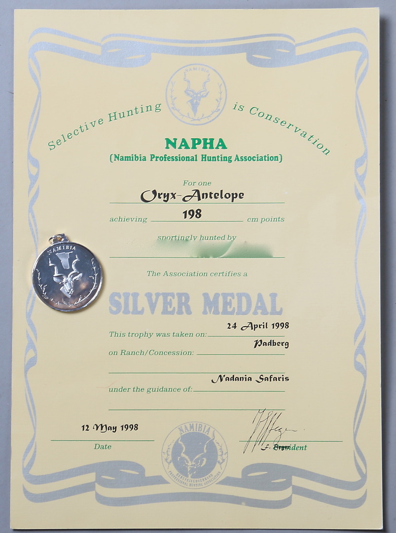 448414. JAGTROFÆET, Oryx antilope, (Oryx Gazella), Namibia.