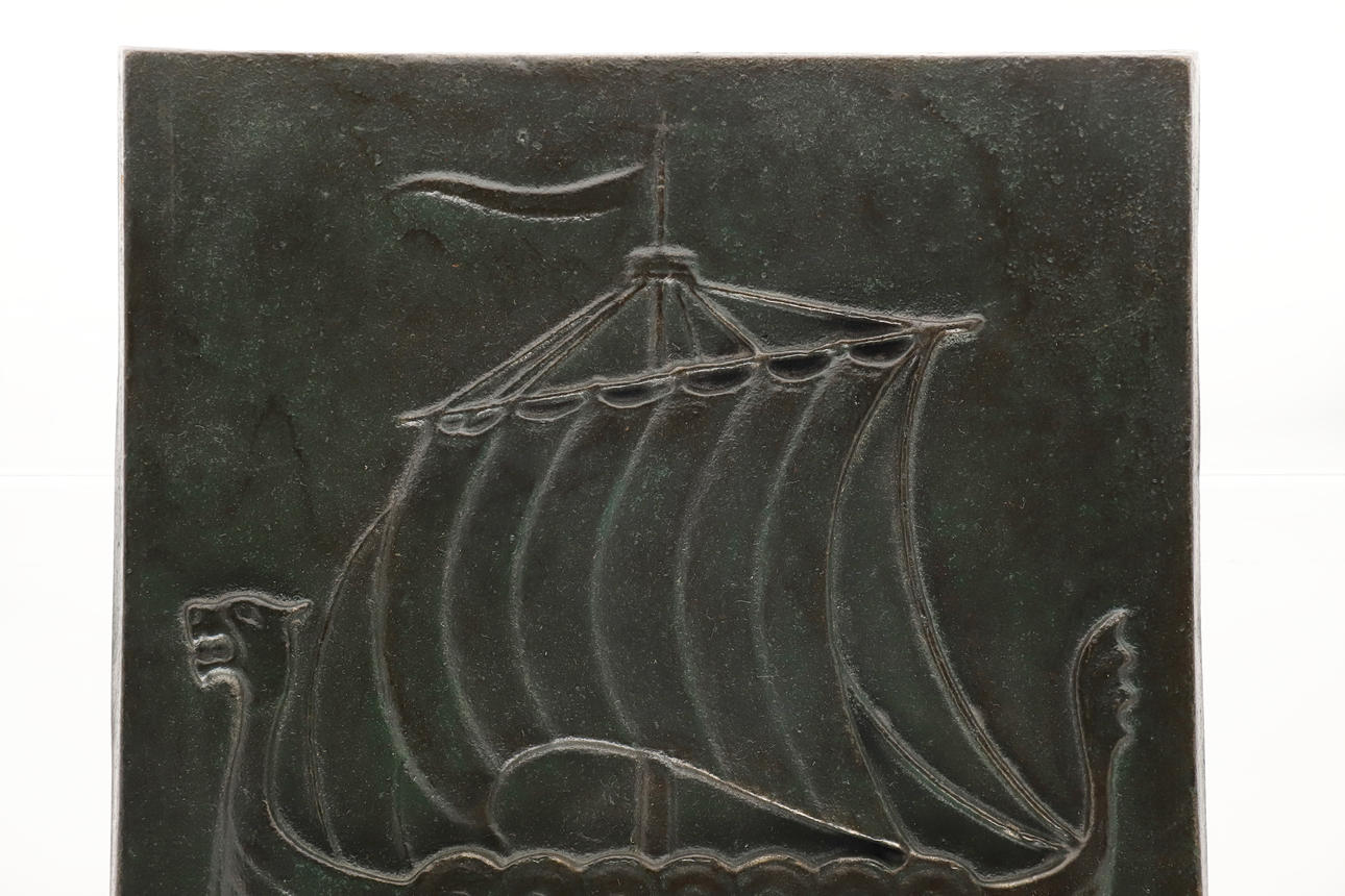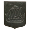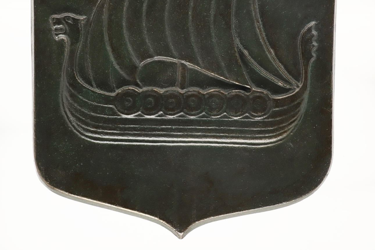 En bronzeplade med skildring af en vikingebåd, signeret bagtil 'Lidingo Stads Vapen'. 24,5 cm høj, 19,5 cm på tværs.