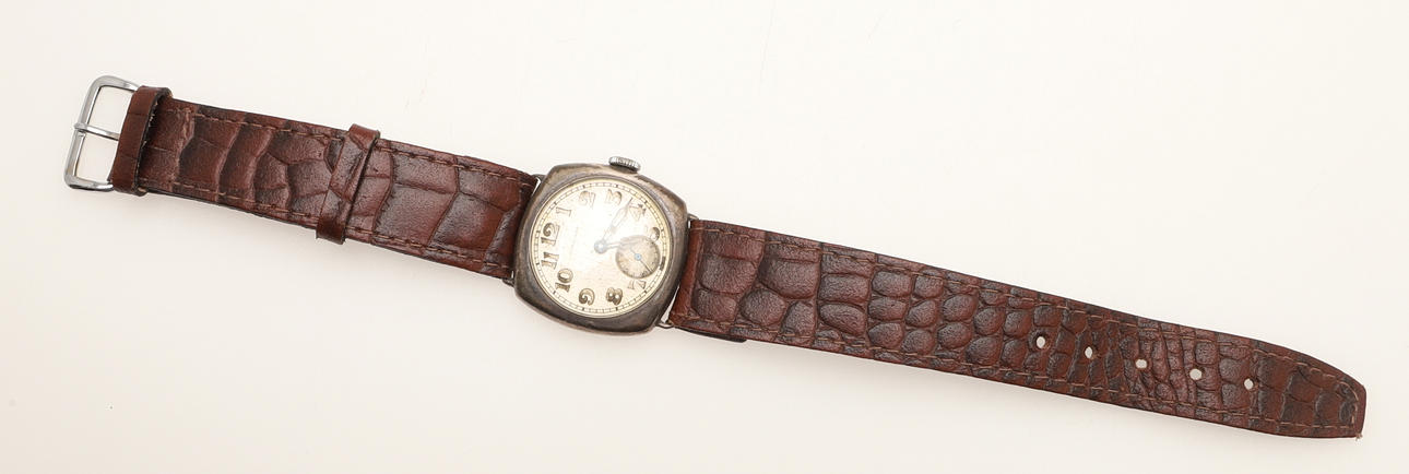 den signerede cirkulære urskive med arabiske tal og sekundær sekundær skive, på en brun læderrem, 28mm dia.