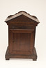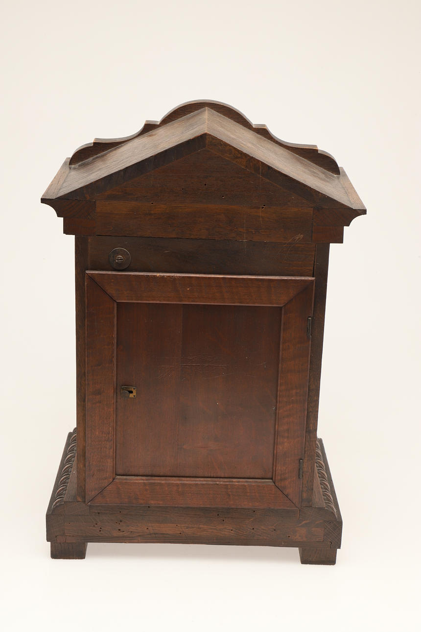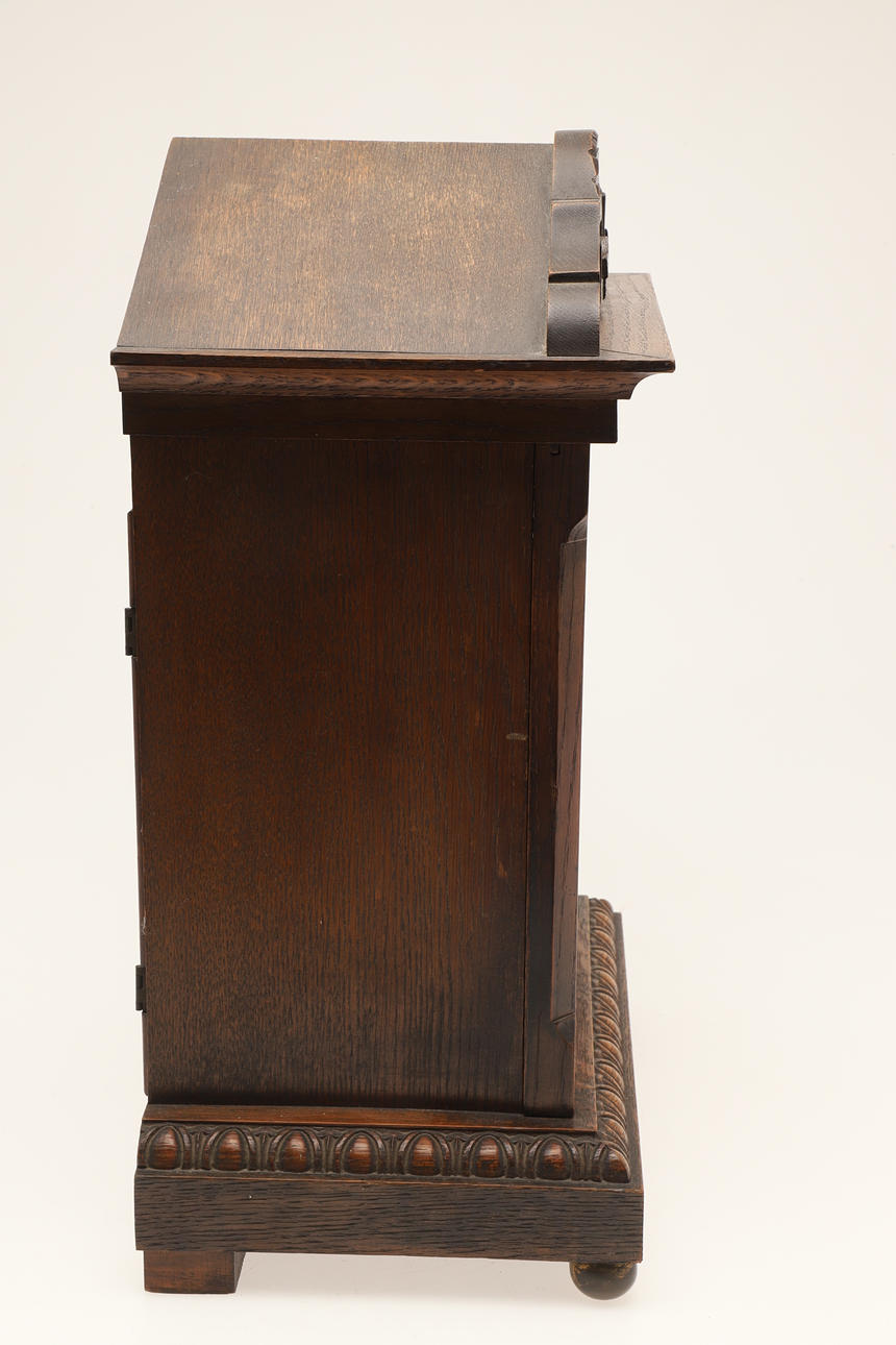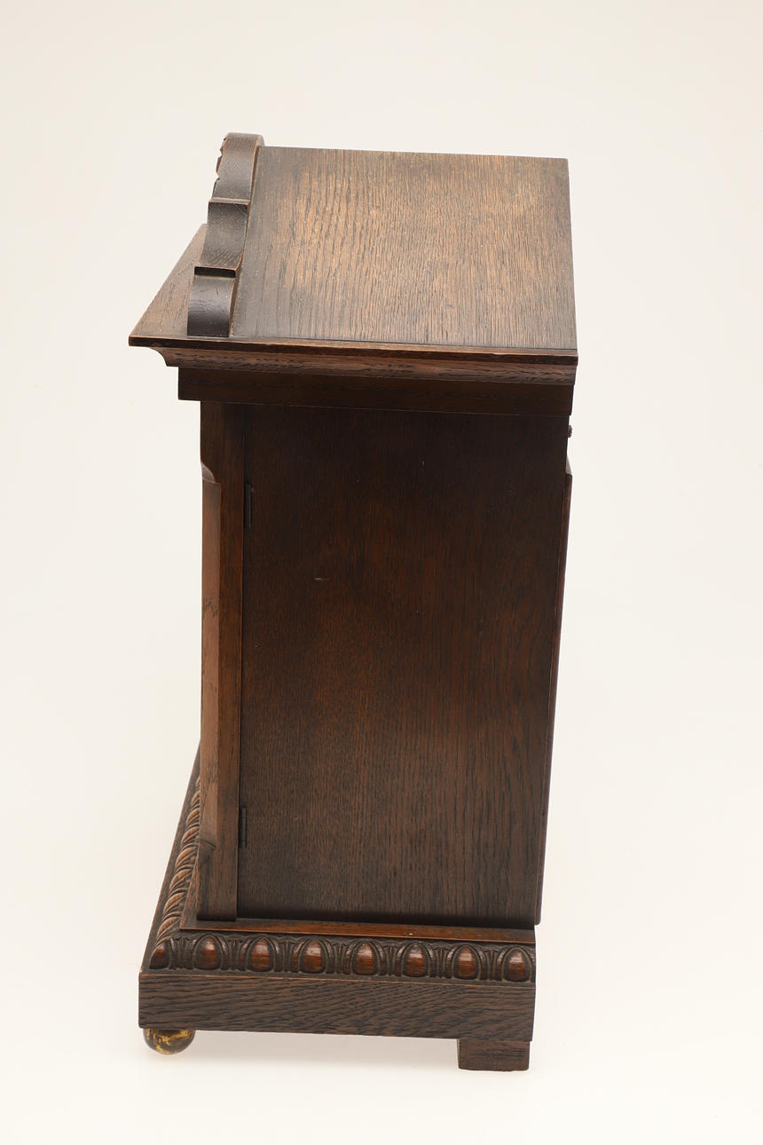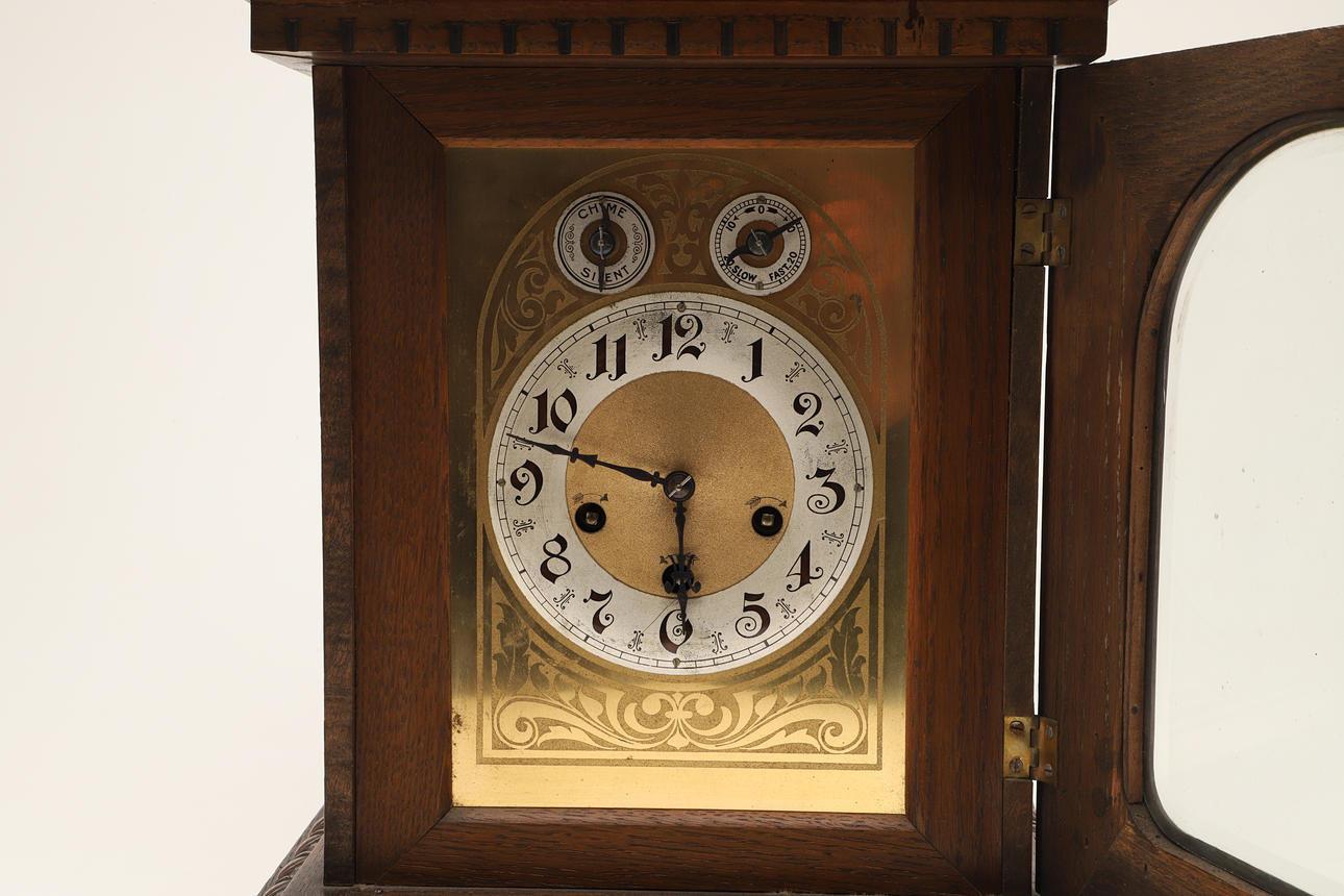 Et tidligt 20. århundrede stort egetræskantur, med en forsølvet urskive og to sekundære urskiver, og med udskåret dekoration til bunden og messingfødder foran. 46 cm høj.