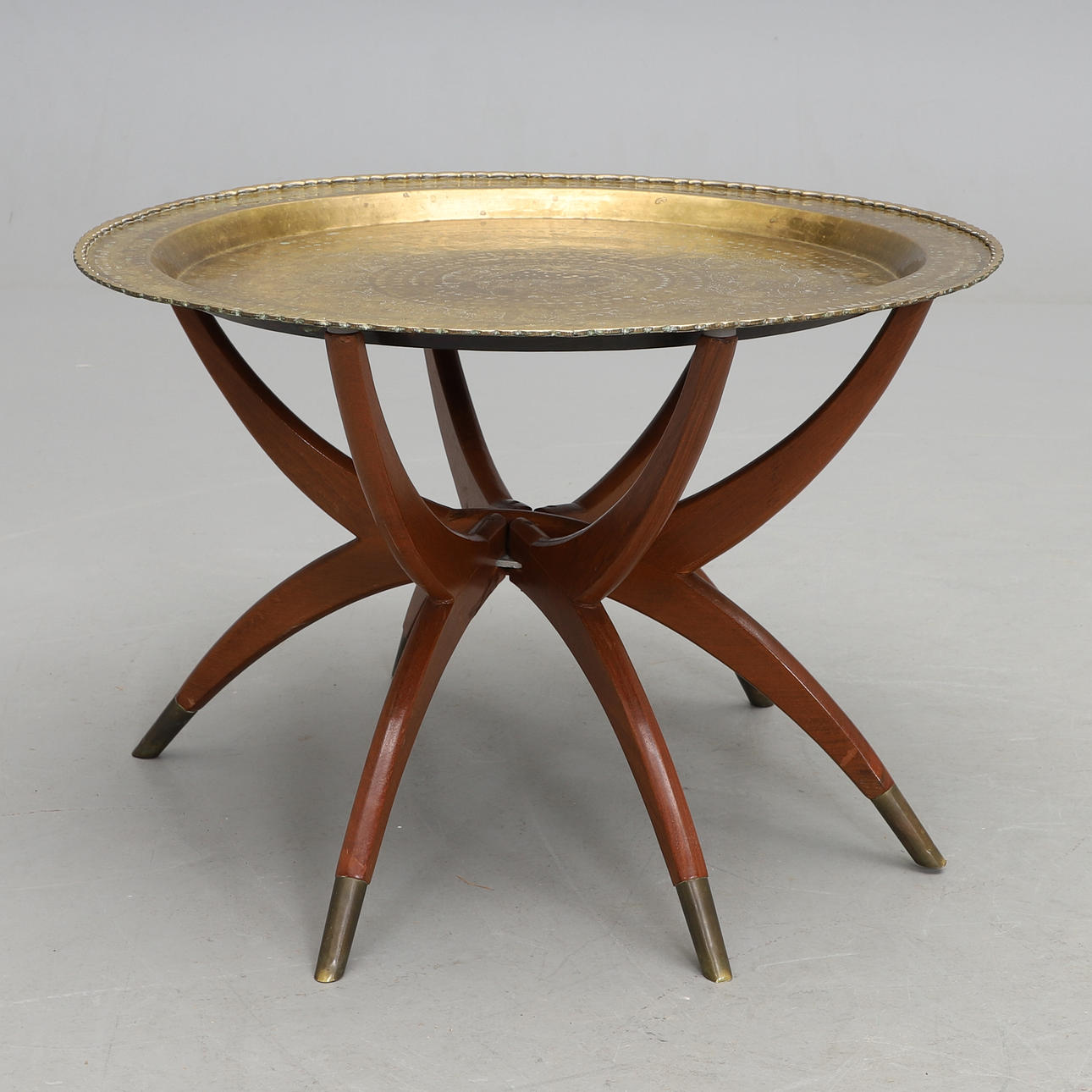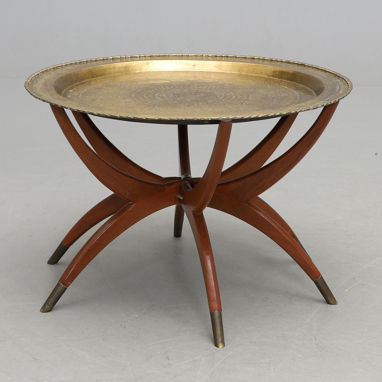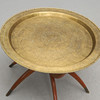 Foldbart undervogn med benender beklædt med messing. Løs skive lavet af messing. Højde 47, diameter 70 cm.