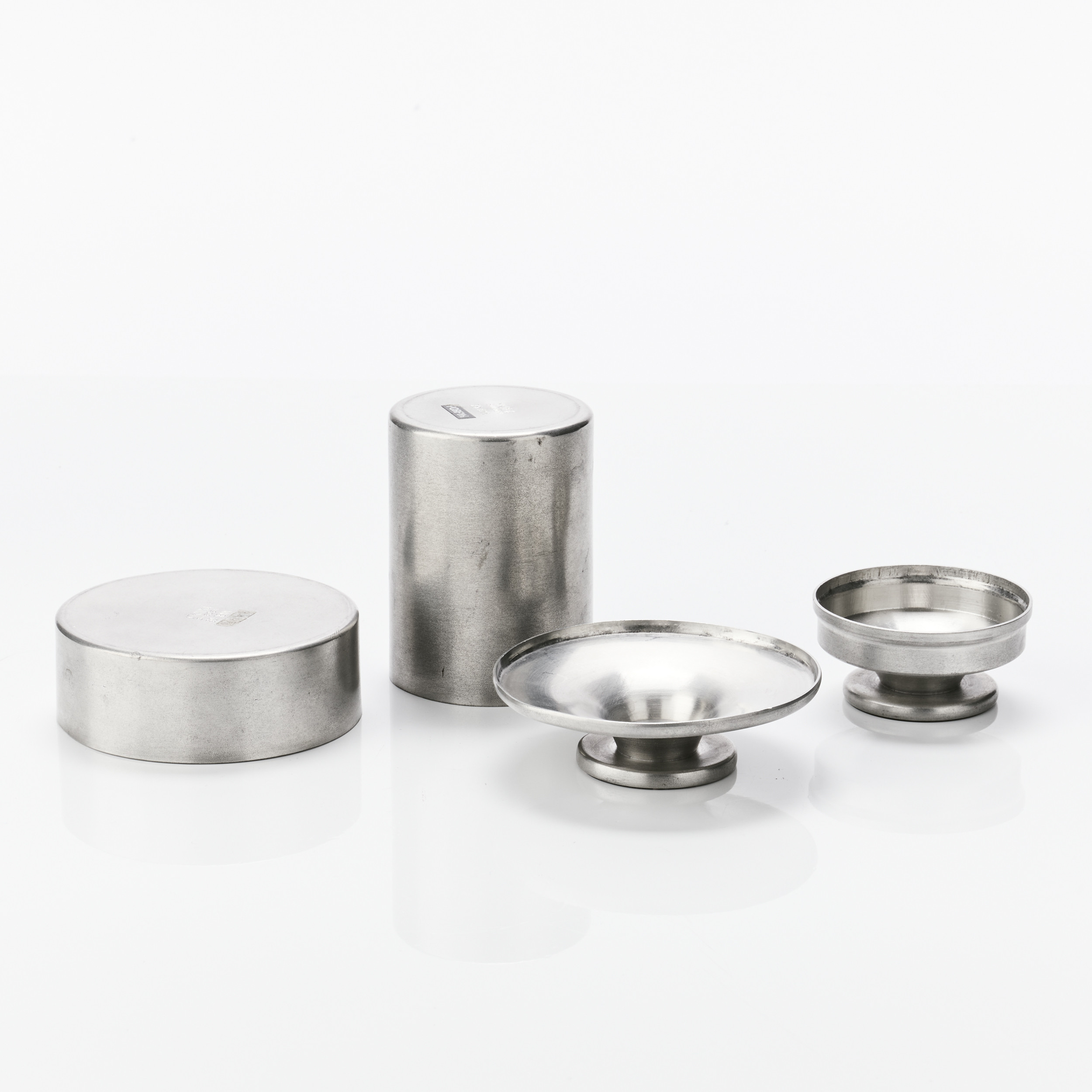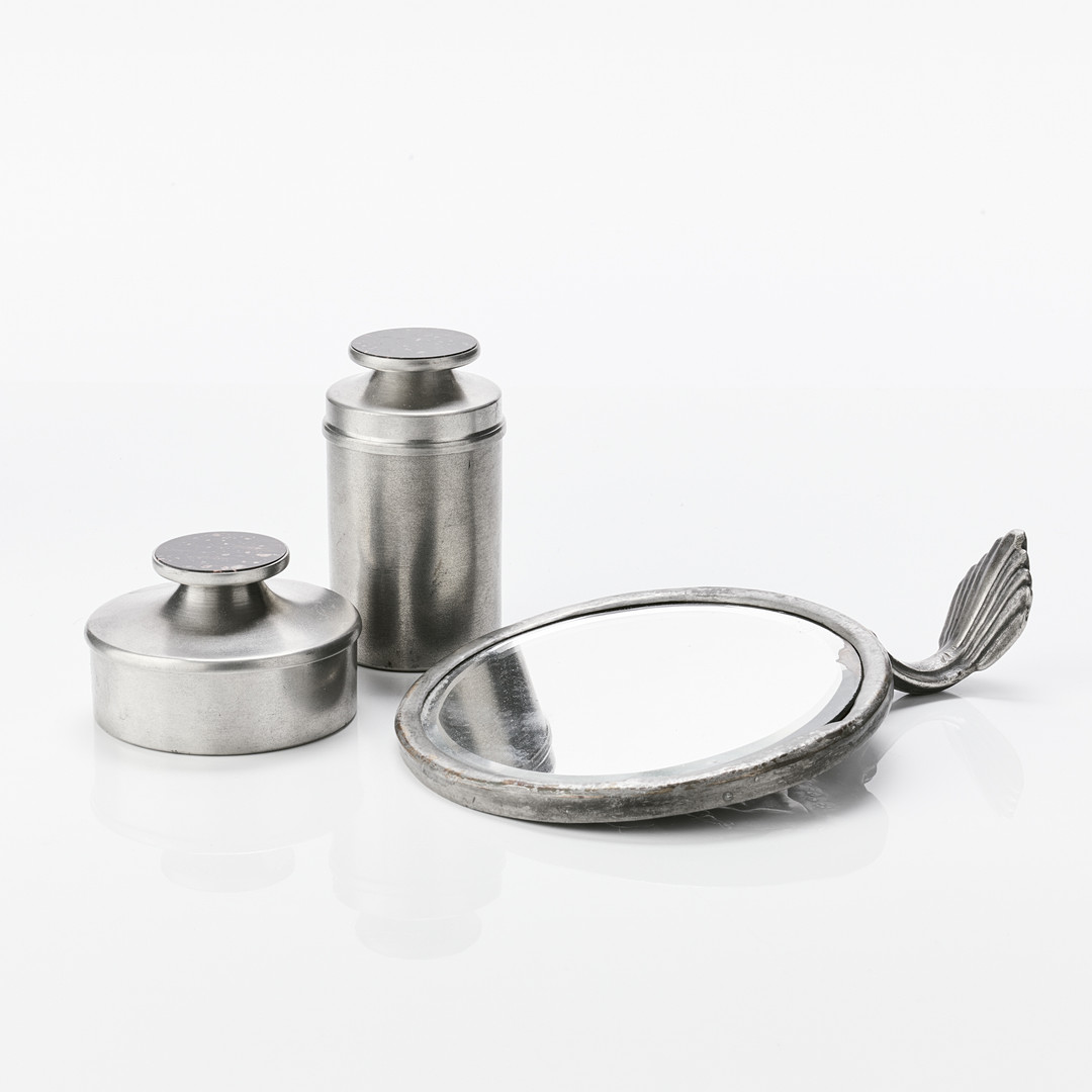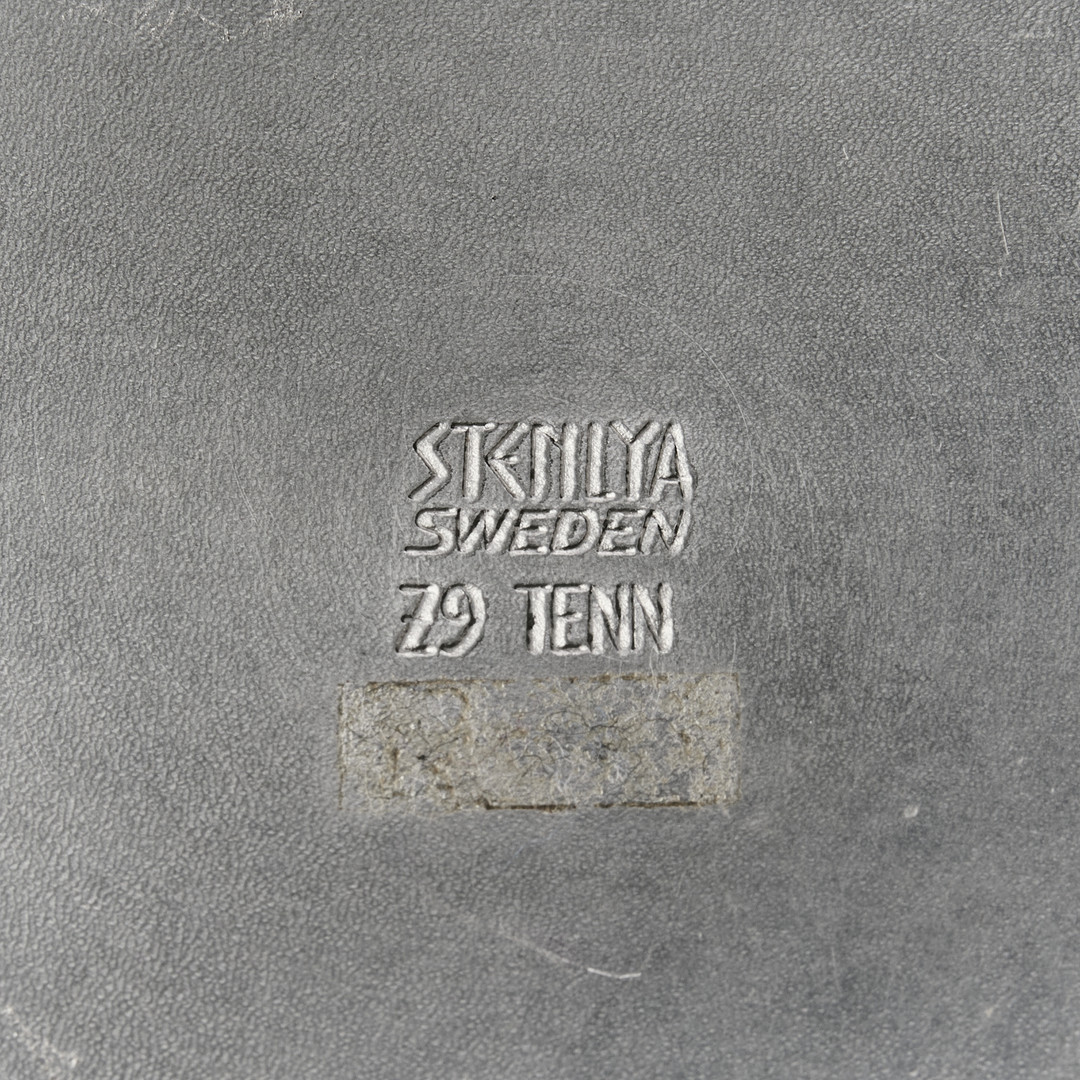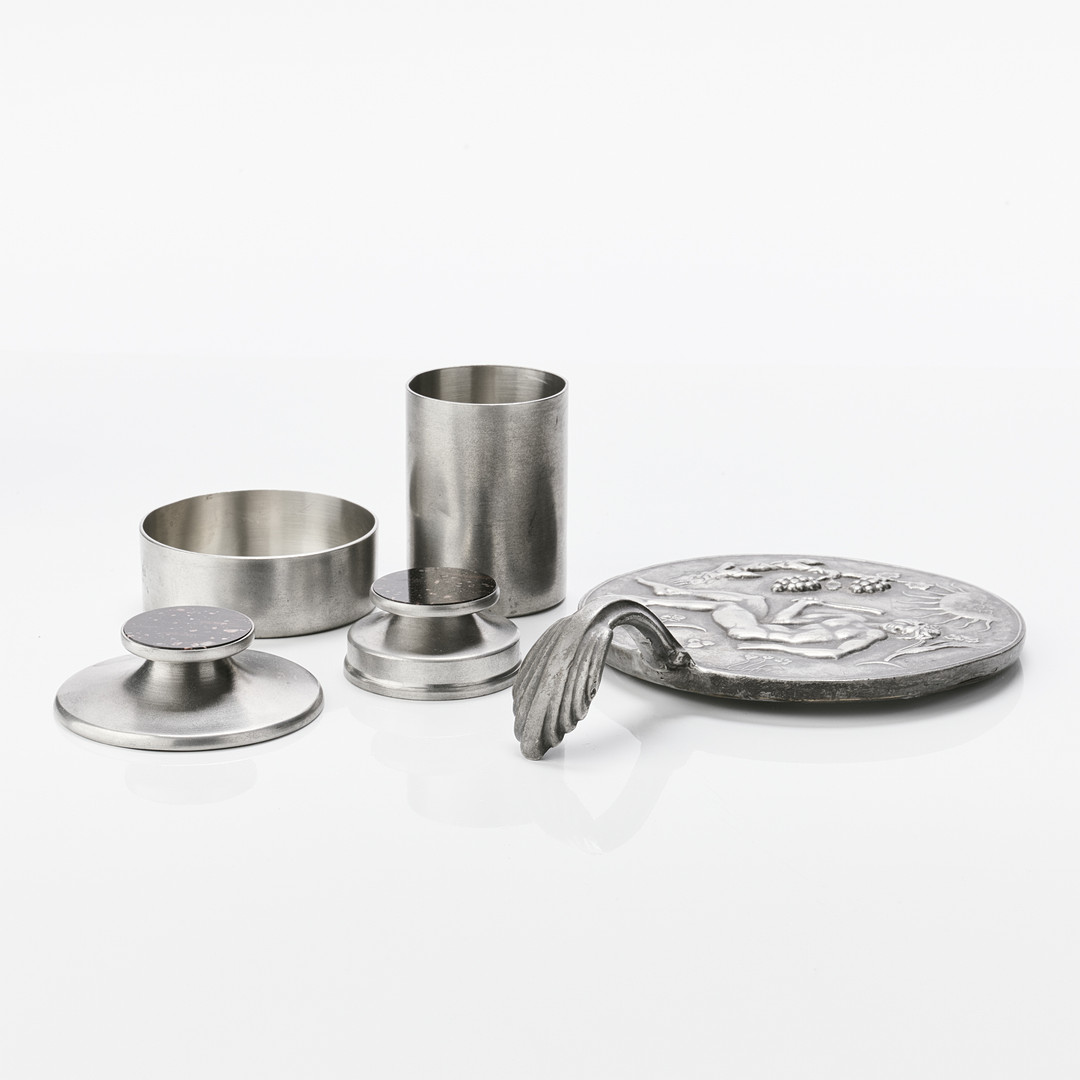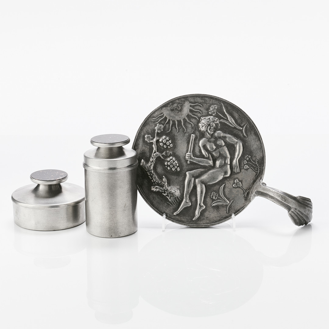 4532818. TO ASKAR, stemplet Stenlya, 1974, tin med monterede plader i Rännåporphyr fra Älvdalen, NILS FOUGSTEDT. Håndspejl, 1920/30'erne, model 508, tin/fortinnet messing, signeret NF.