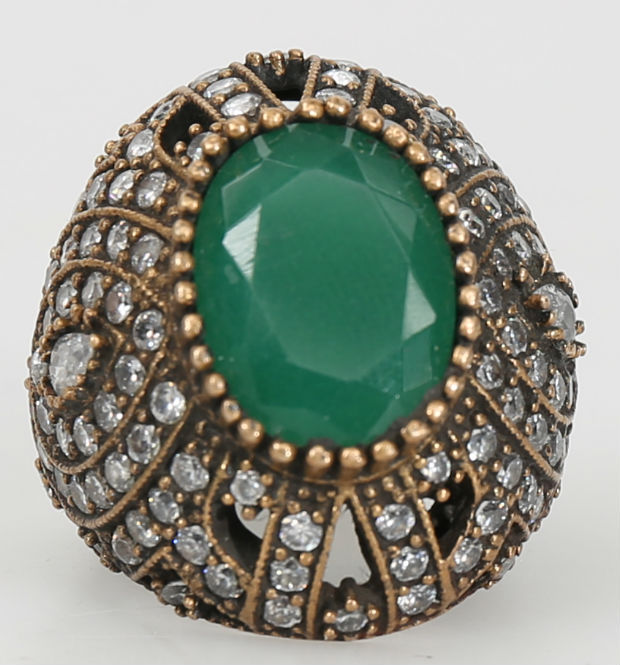 454762. RING, sølv, bronze, grønne og hvide sten, 2000-tallet.