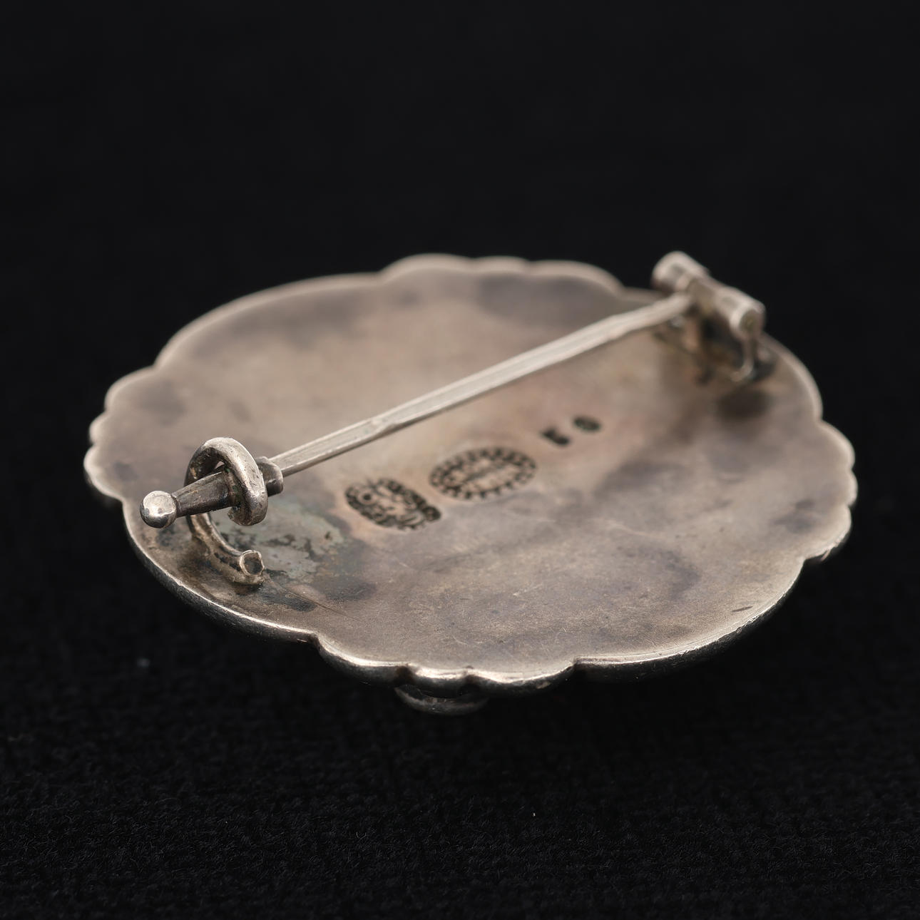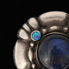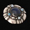 Broche med labradorites og opaler, stempel fra Georg Jensen 1915-1937. Diameter 37 mm.