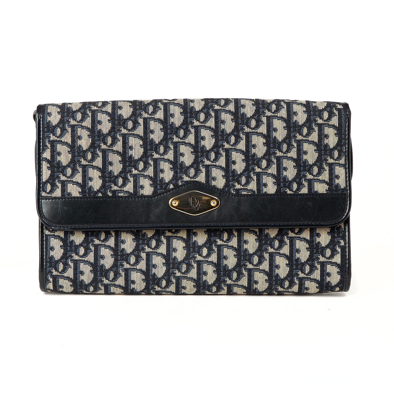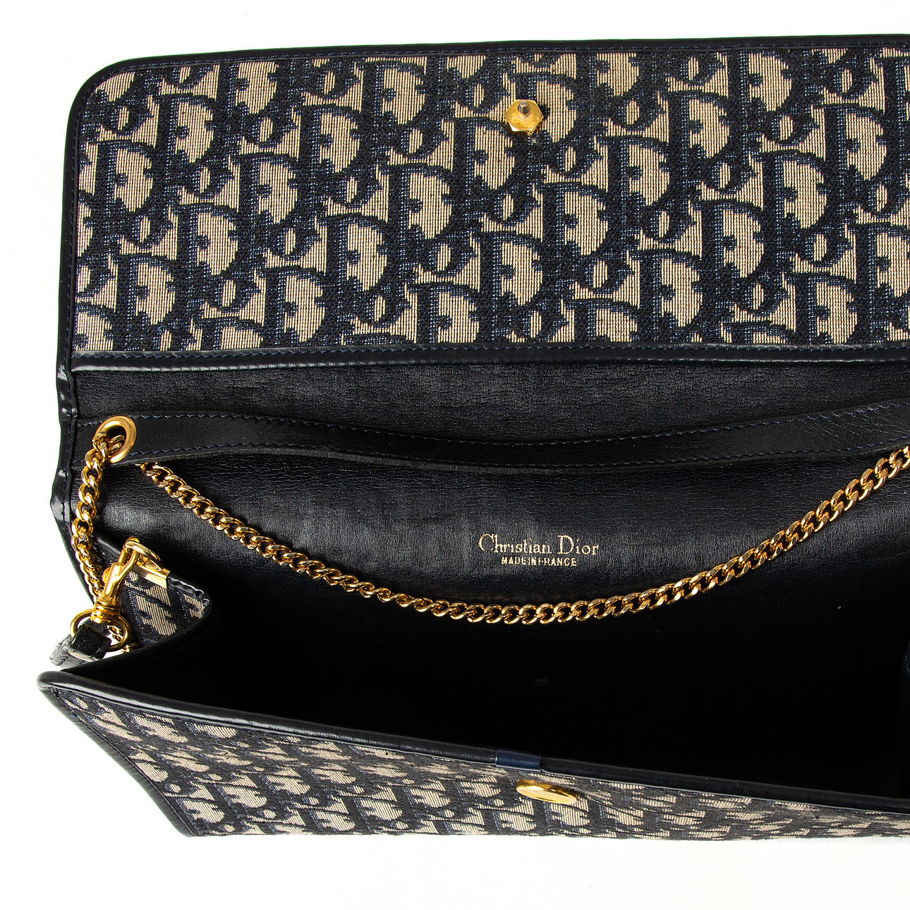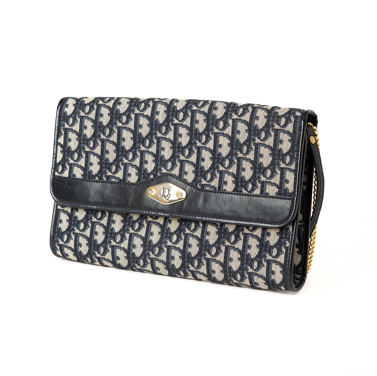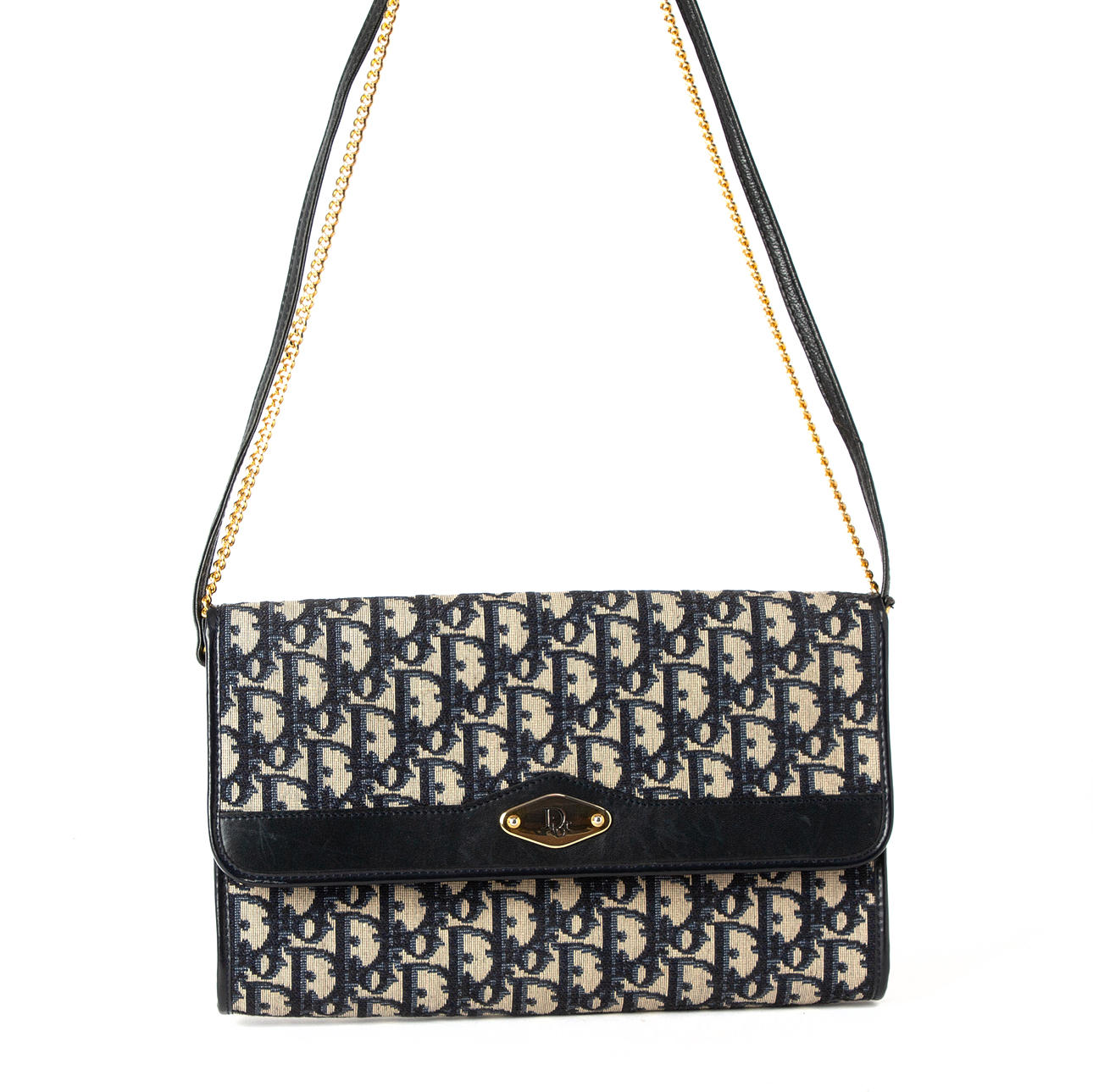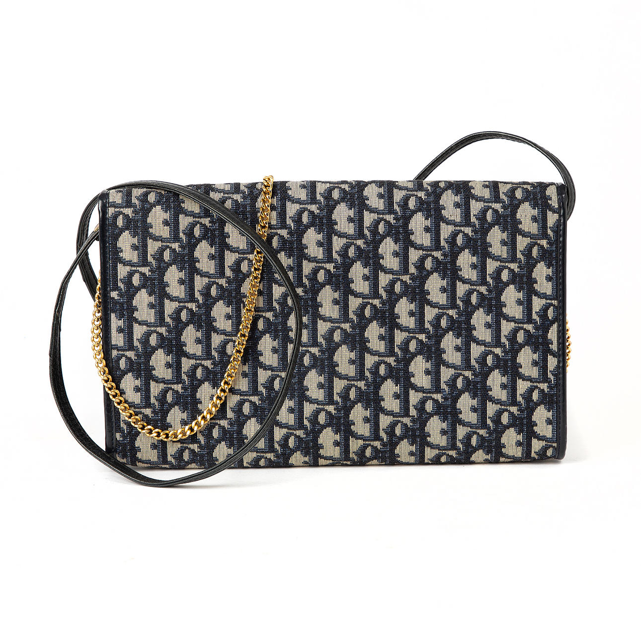 Monogram mønster „Trotteur“ i blåt farveskema. Detaljer af læder. Med kæde og ekstra, aftagelig skulderrem i læder.