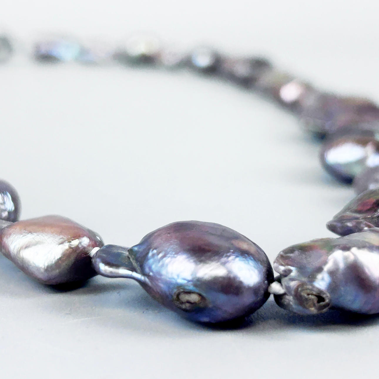 En imponerende halskæde af store grå barokkultiverede perler på en metallås. L. 80 cm. Perler ca. 2 cm til 3 cm længde.