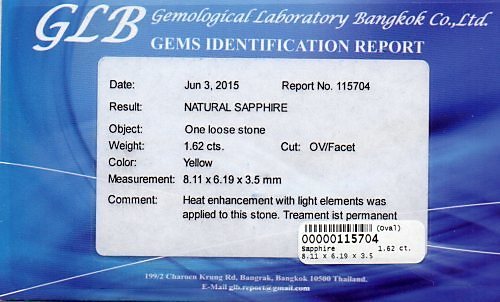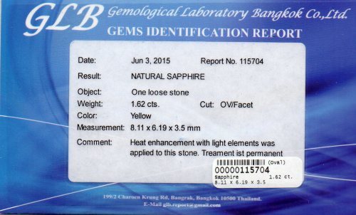 462091. SAPPIR, 1,62 CT. Gul, certifikat.