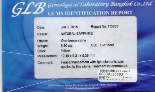 462700. SAPPIR, 5,80 CT. Gul, certifikat.
