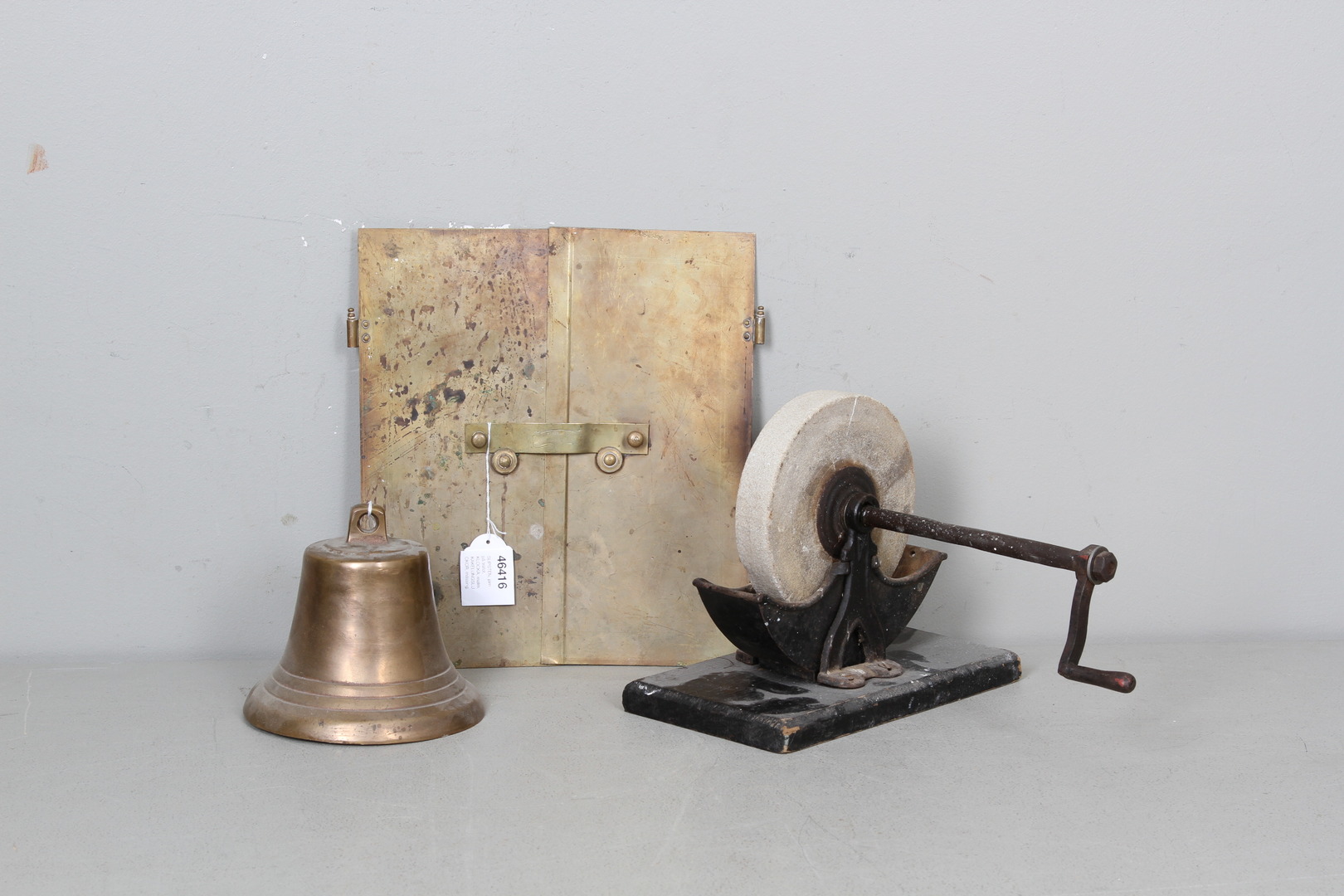 46416. Slibesten, jern på træfod, UR, malm, FLICEDØRE, messing.