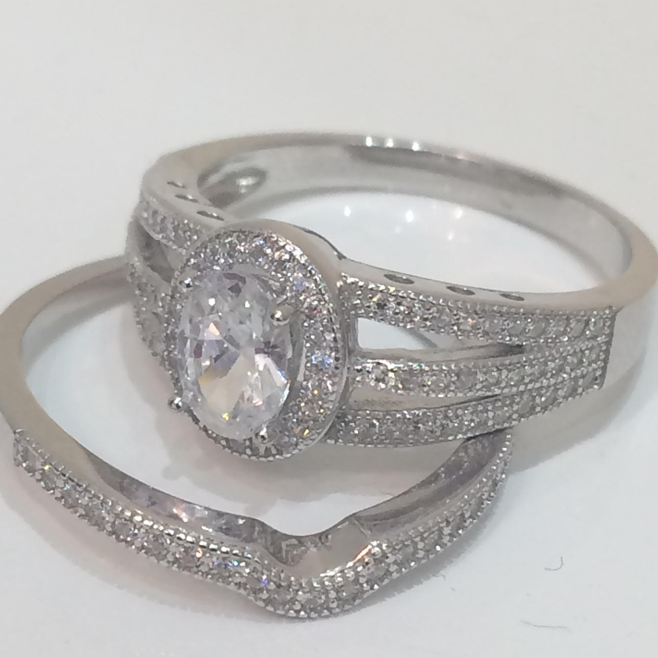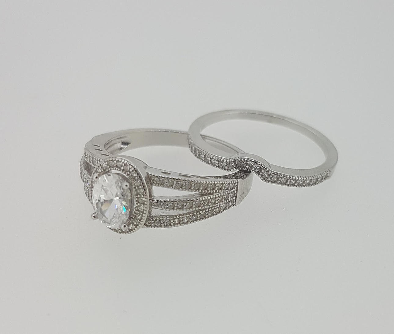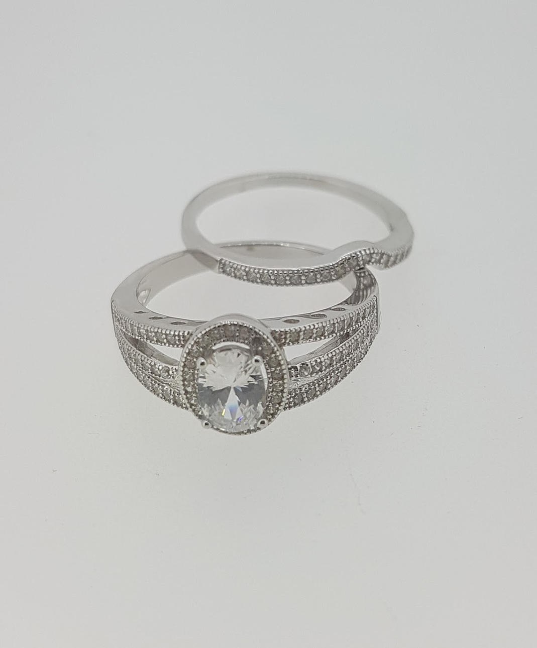 Vielsesringen er formet til at passe til den første ring og beklædt med cz-sten i den øverste halvdel af ringen.