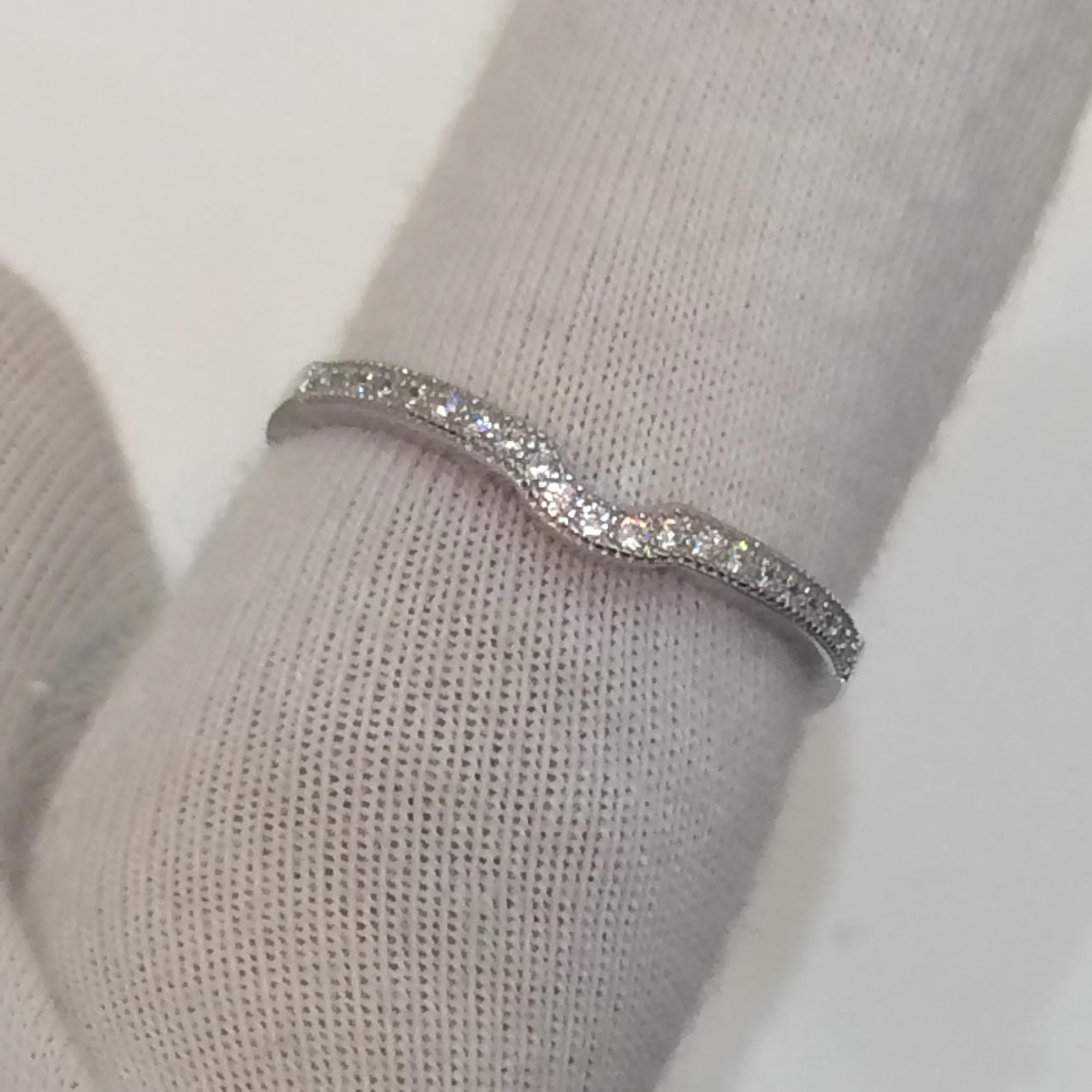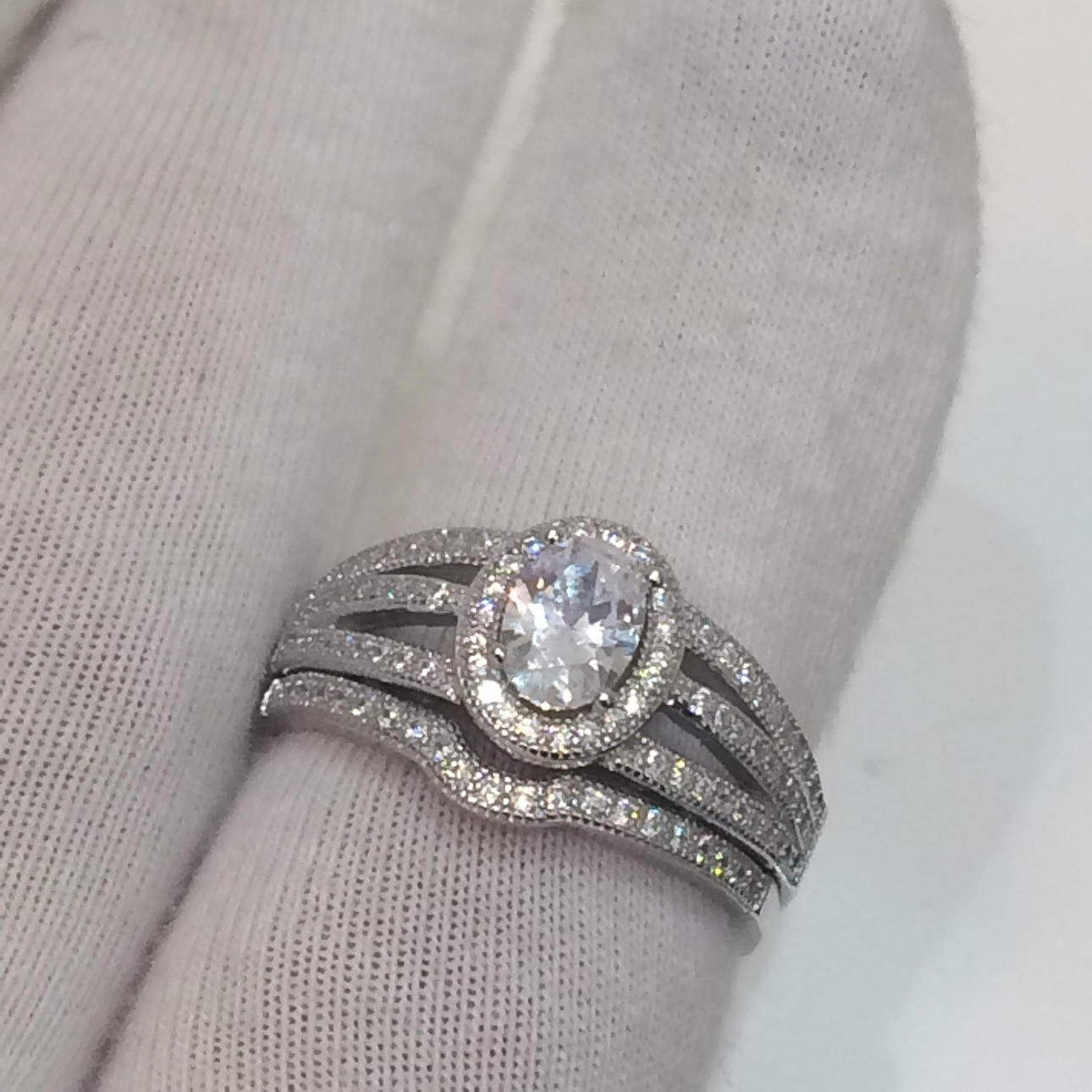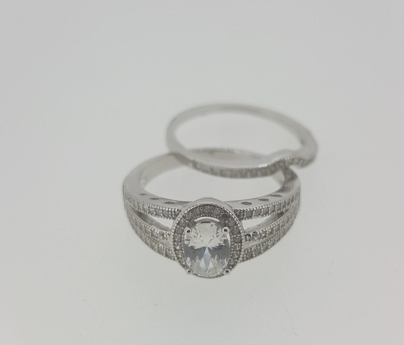 Vielsesringen er formet til at passe til den første ring og beklædt med cz-sten i den øverste halvdel af ringen.
