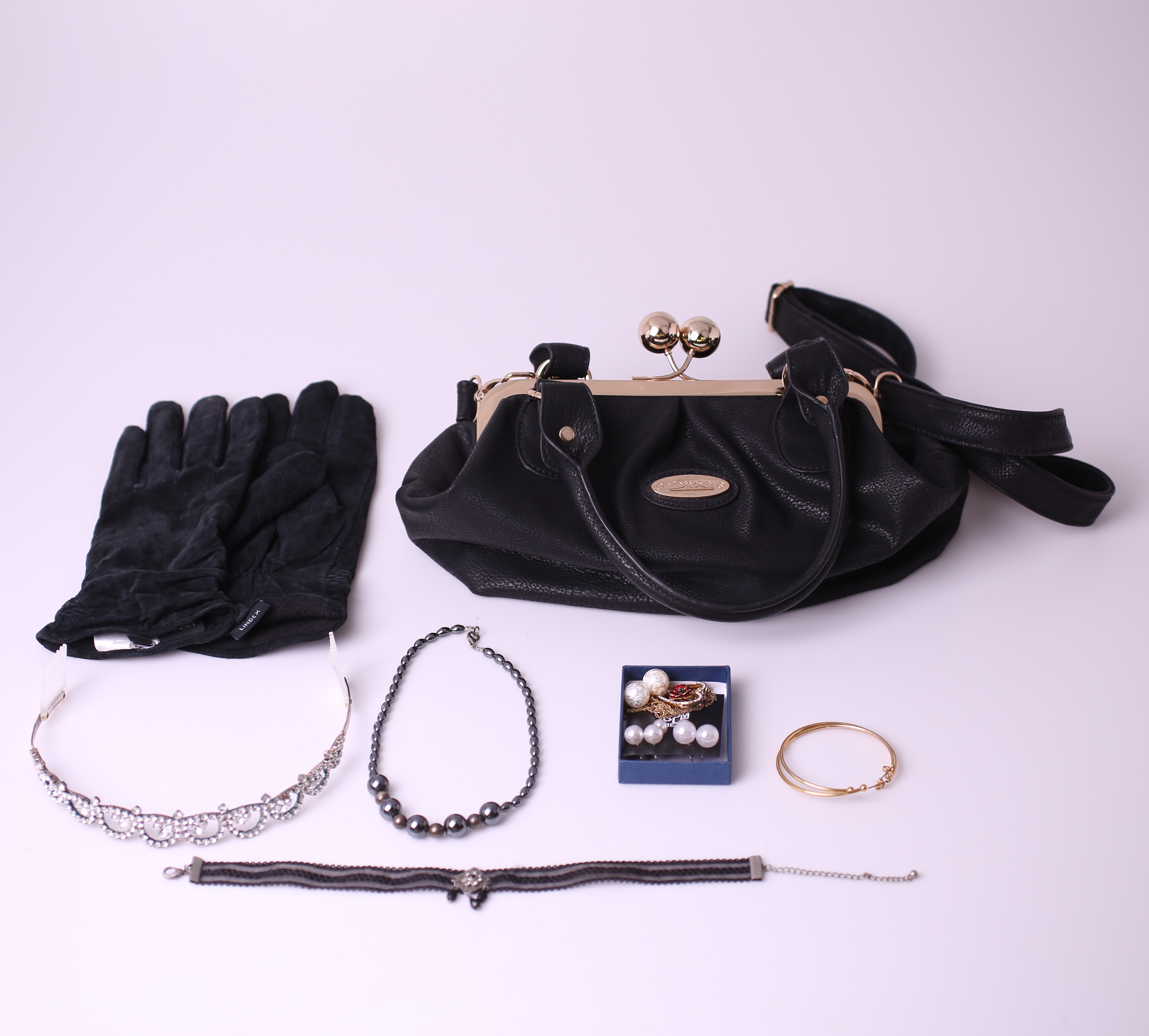 465873. KOSTUMESYKKER + HÅNDTASKE + DAMEHANDSKER.