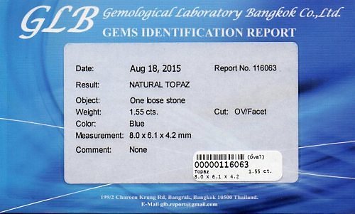 468620. Topaz, 1,55 CT. Himmelblå, certifikat.