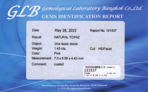 468626. Topaz, 1,45 CT. Pink, certifikat.