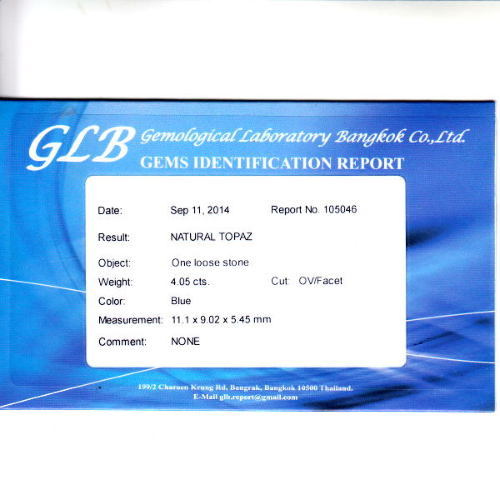468632. Topaz, 4,05 CT. Himmelblå, certifikat.