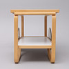 Birk med hvide laminatplader, hvide hjul med sorte gummistrimler, højde 56 cm. Brædderne måler ca. 80x50 cm.