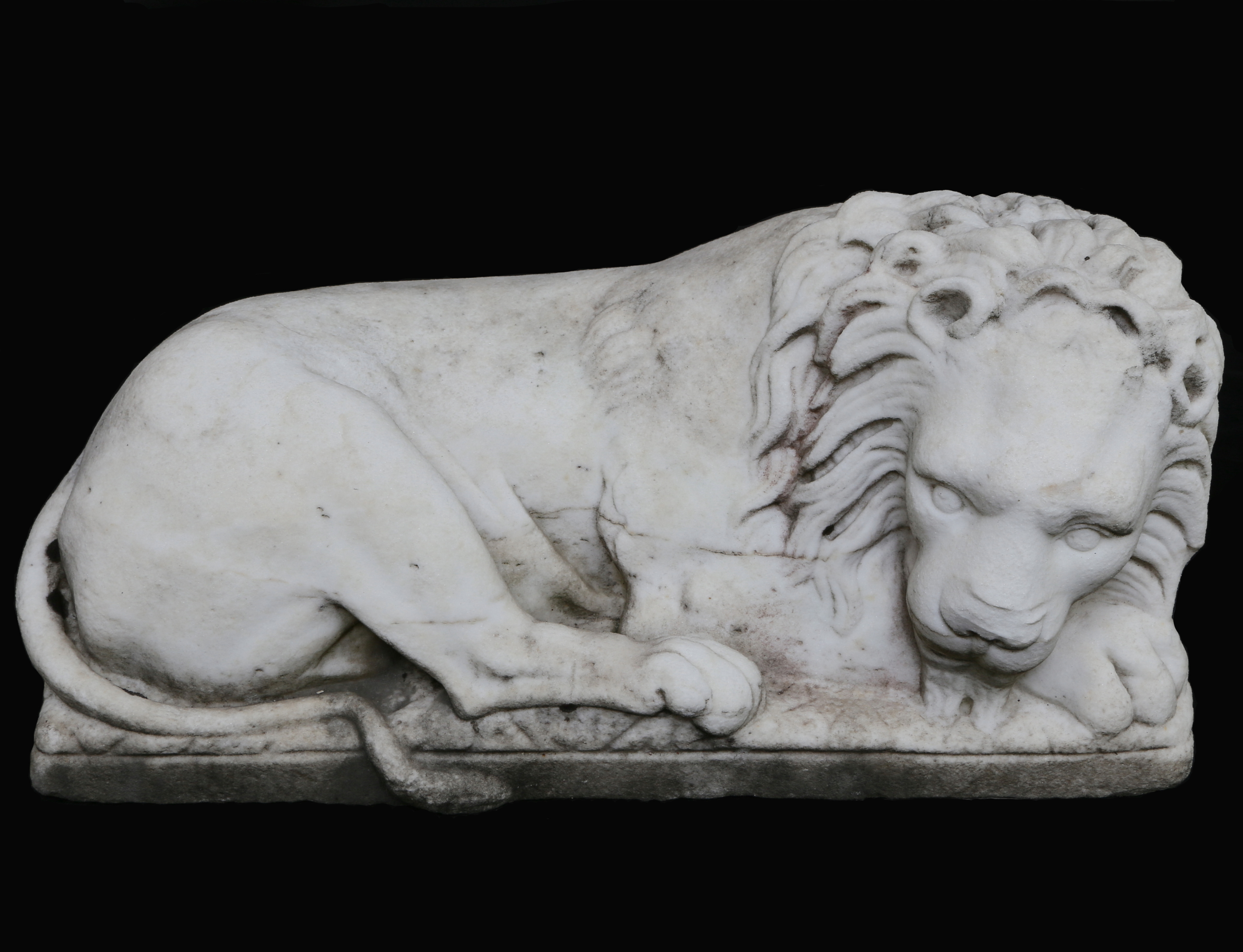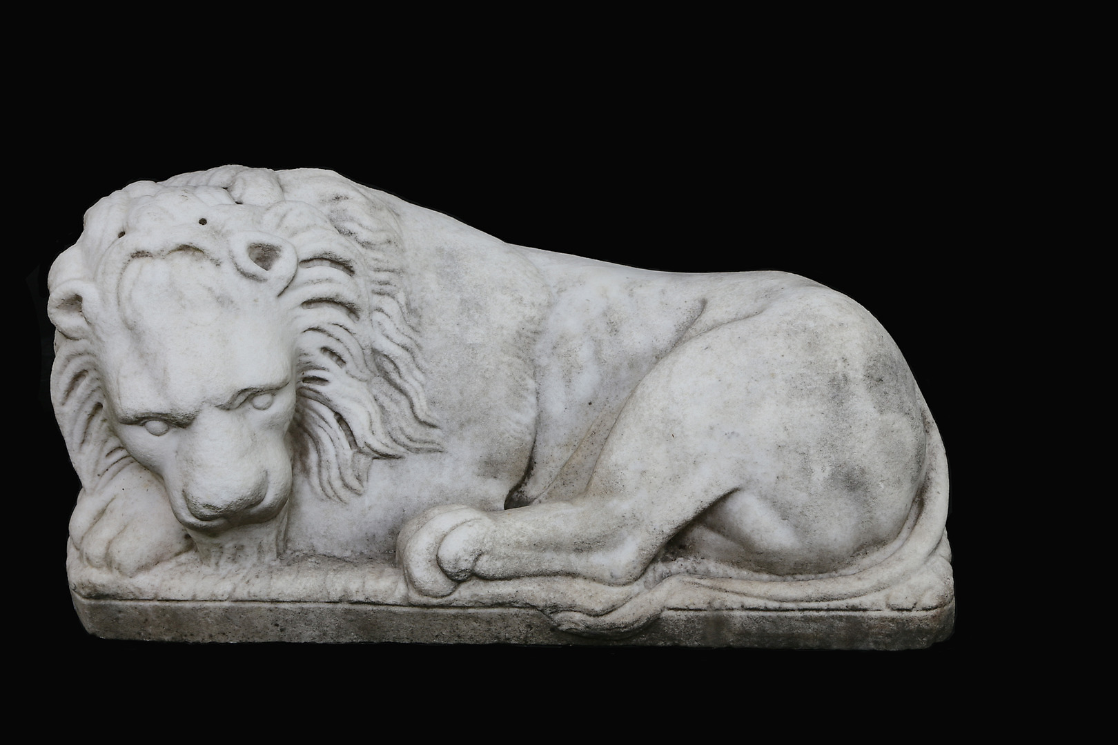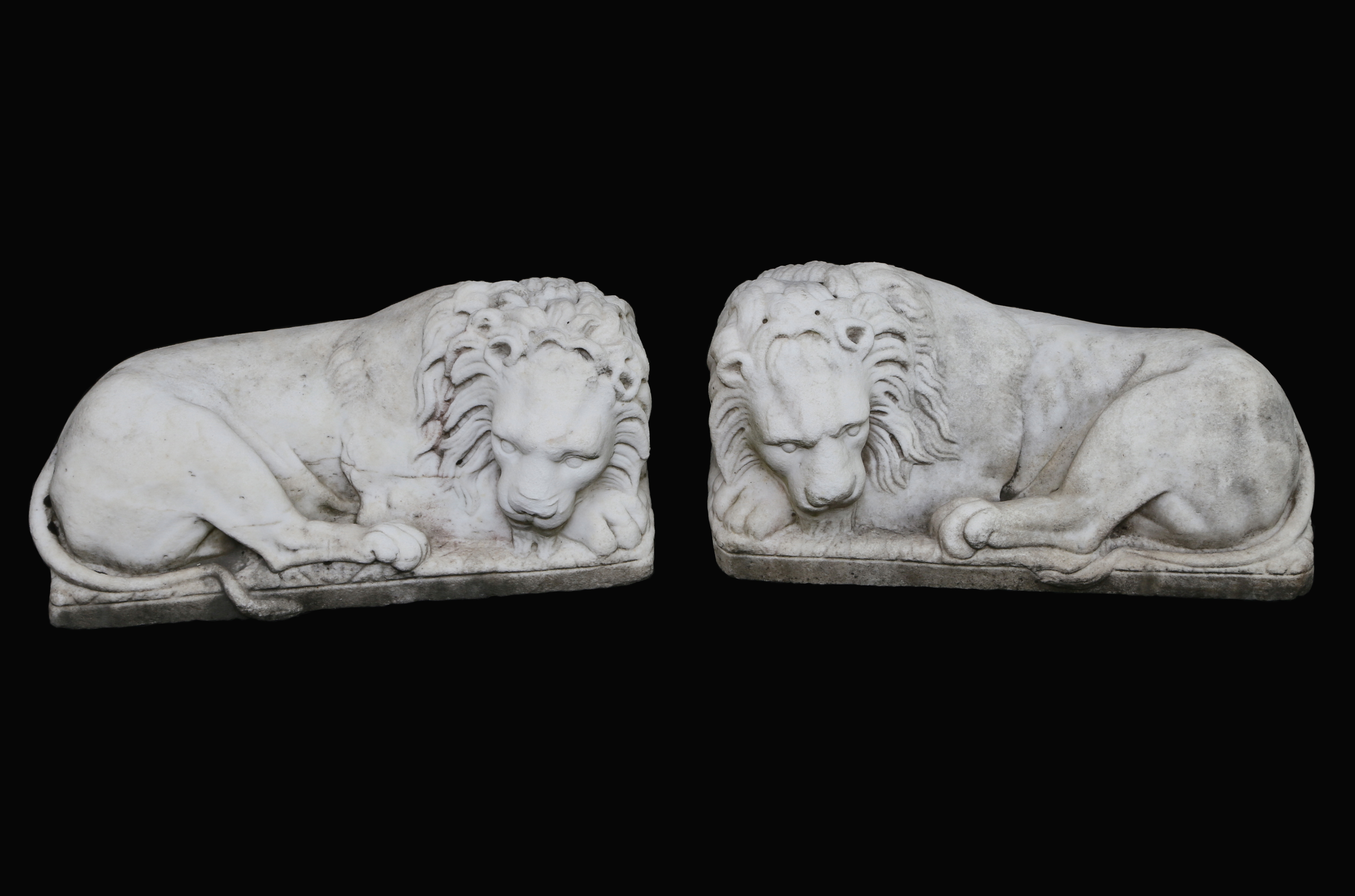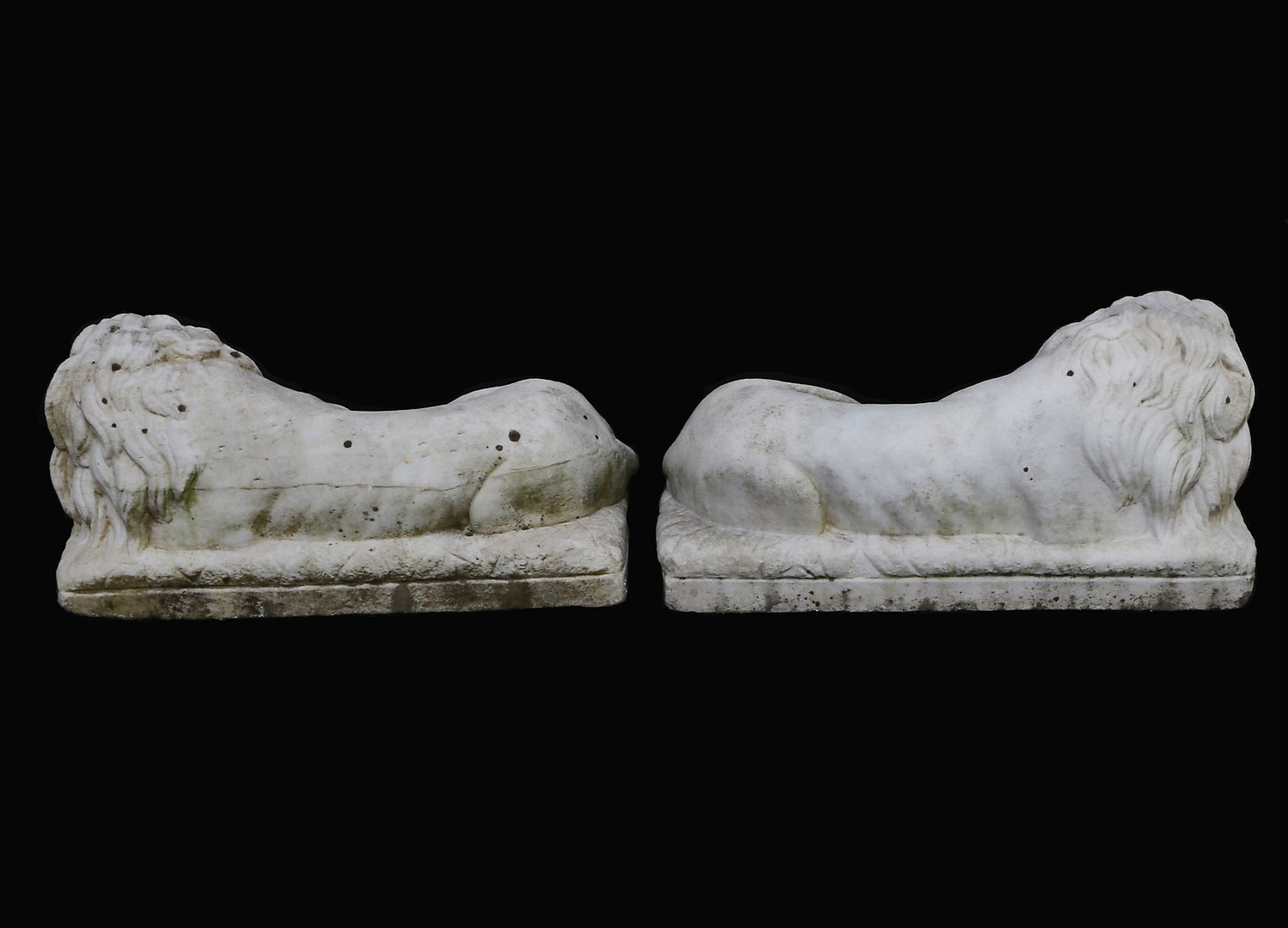 471784. STATUER, 1 par, løver, marmor, 20. århundrede.