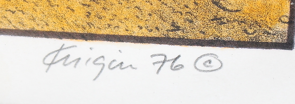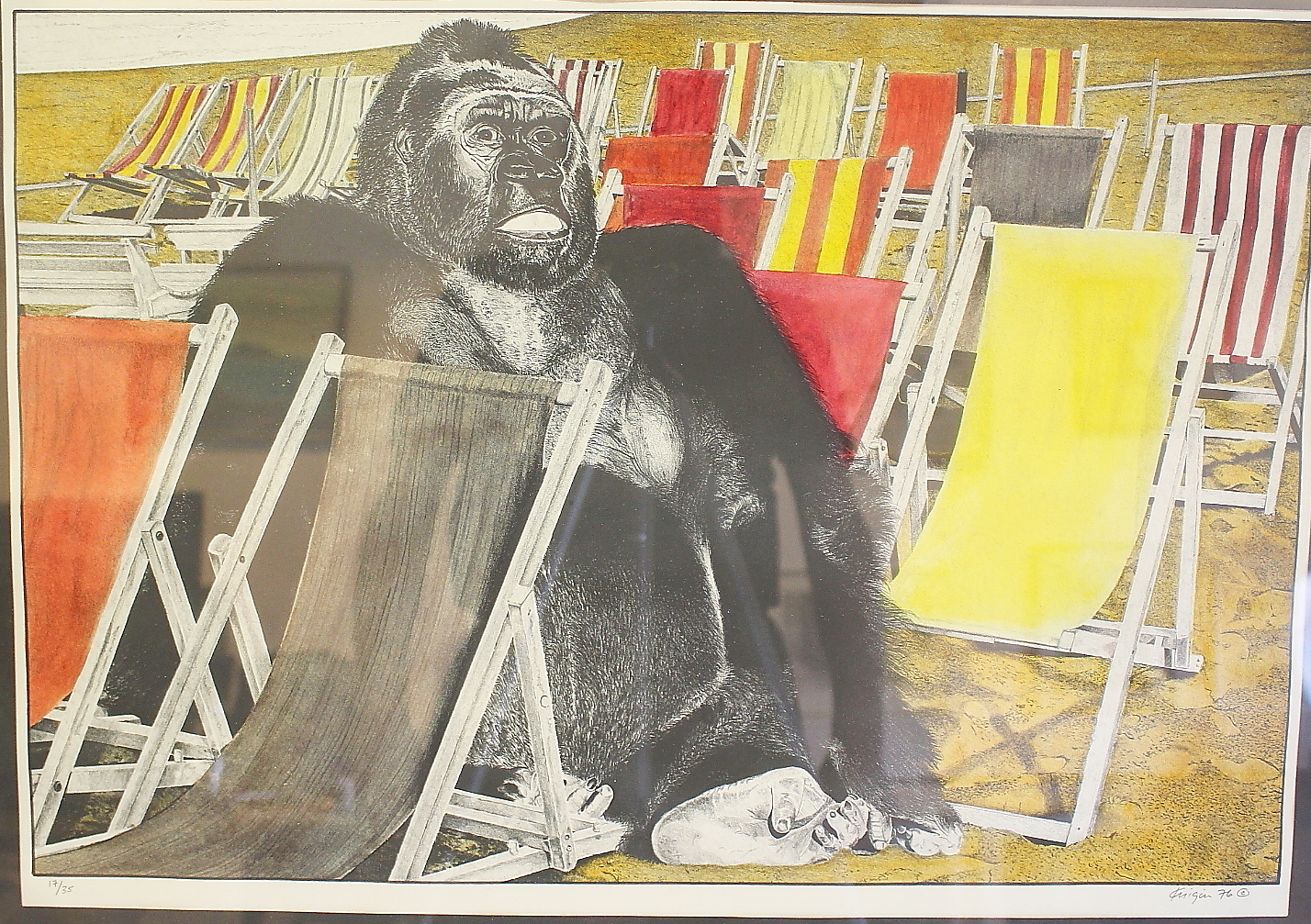 472359. OIDENTIFIERAD KONSTNÄR. Farvelitografi, Gorilla i liggestol.