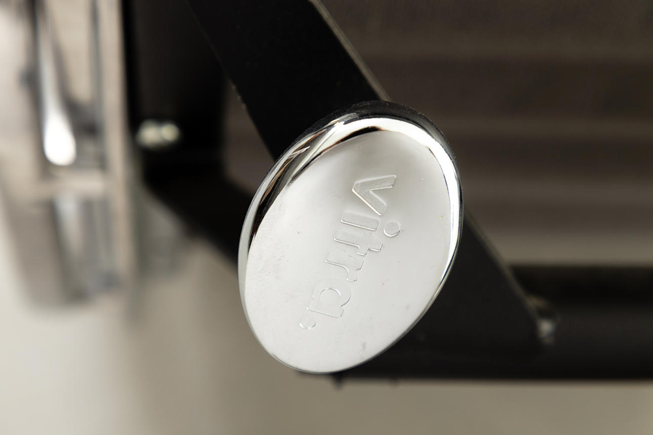 Design: 1958. Udgave: 2000'erne. Drejbar, med hjul, højdejusterbar, vippefunktion. Forkromet aluminium. Hopsak betræk i gråt.