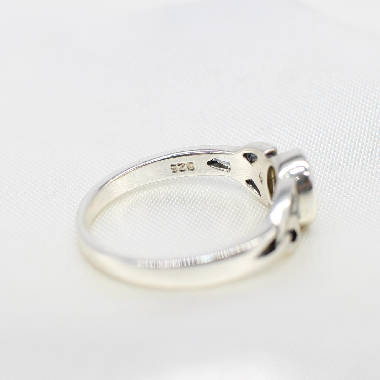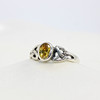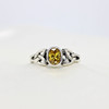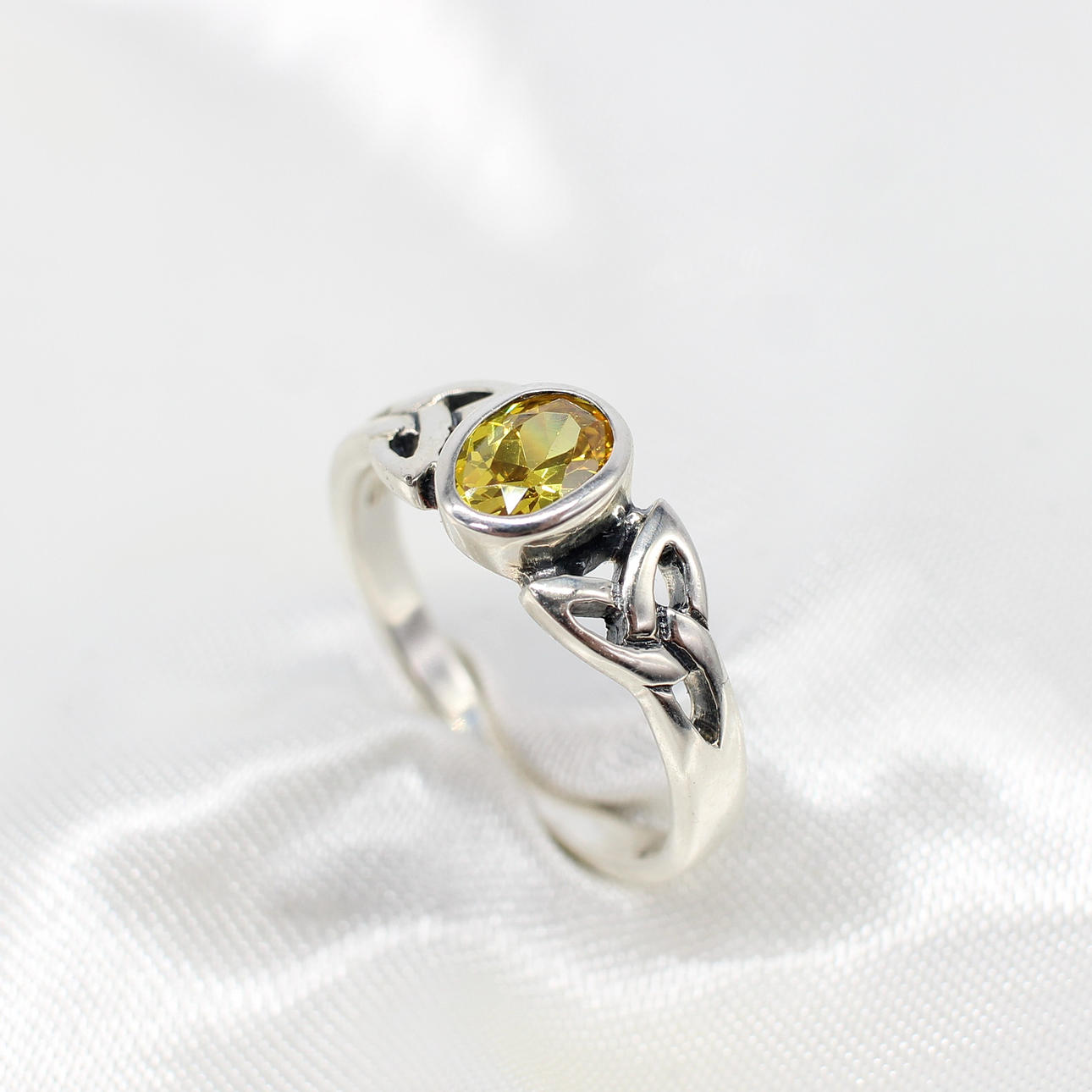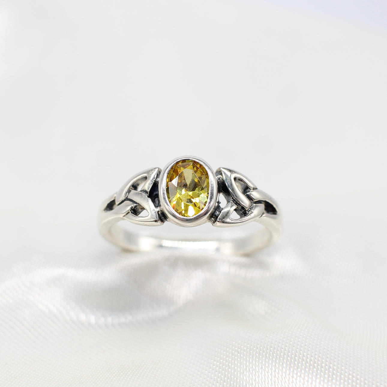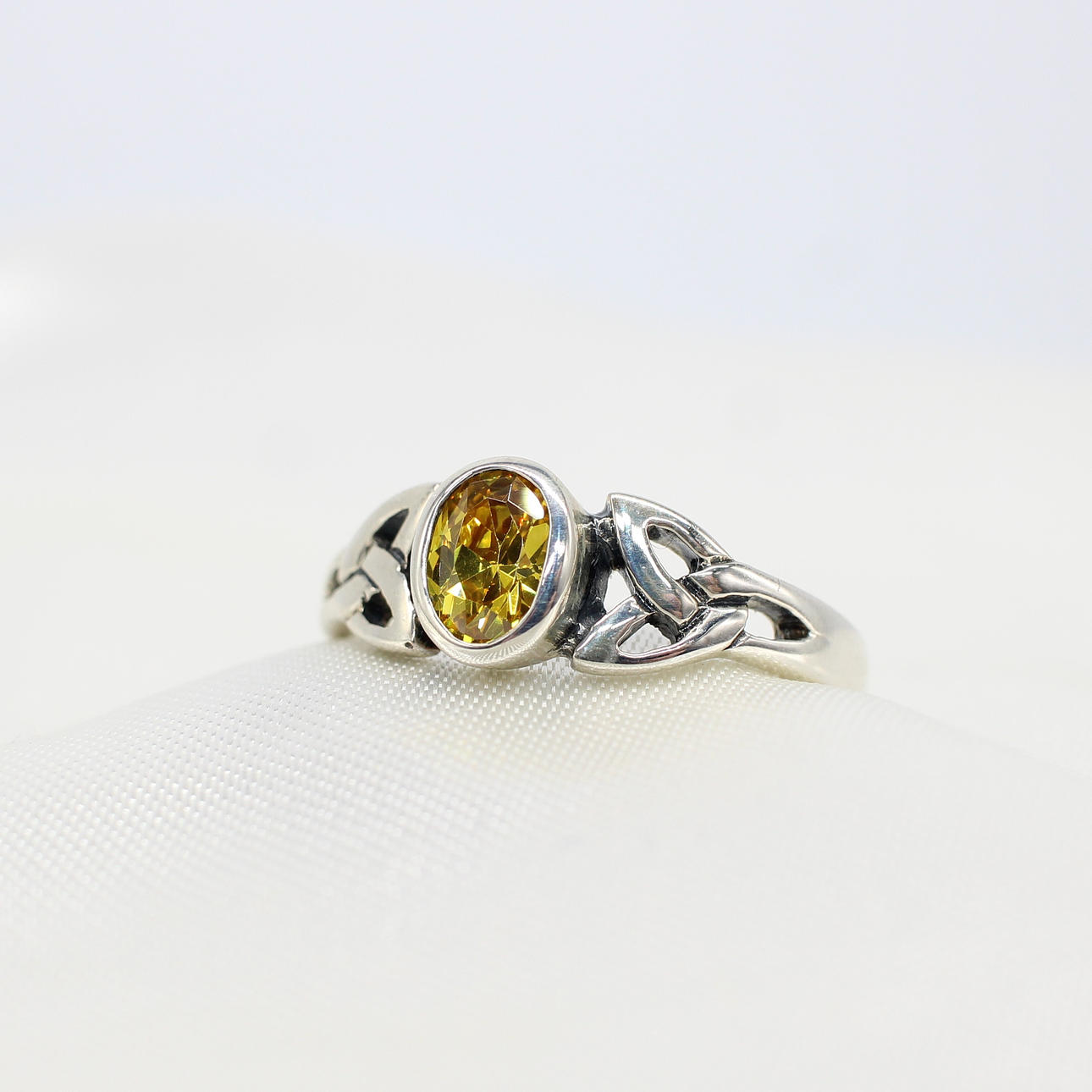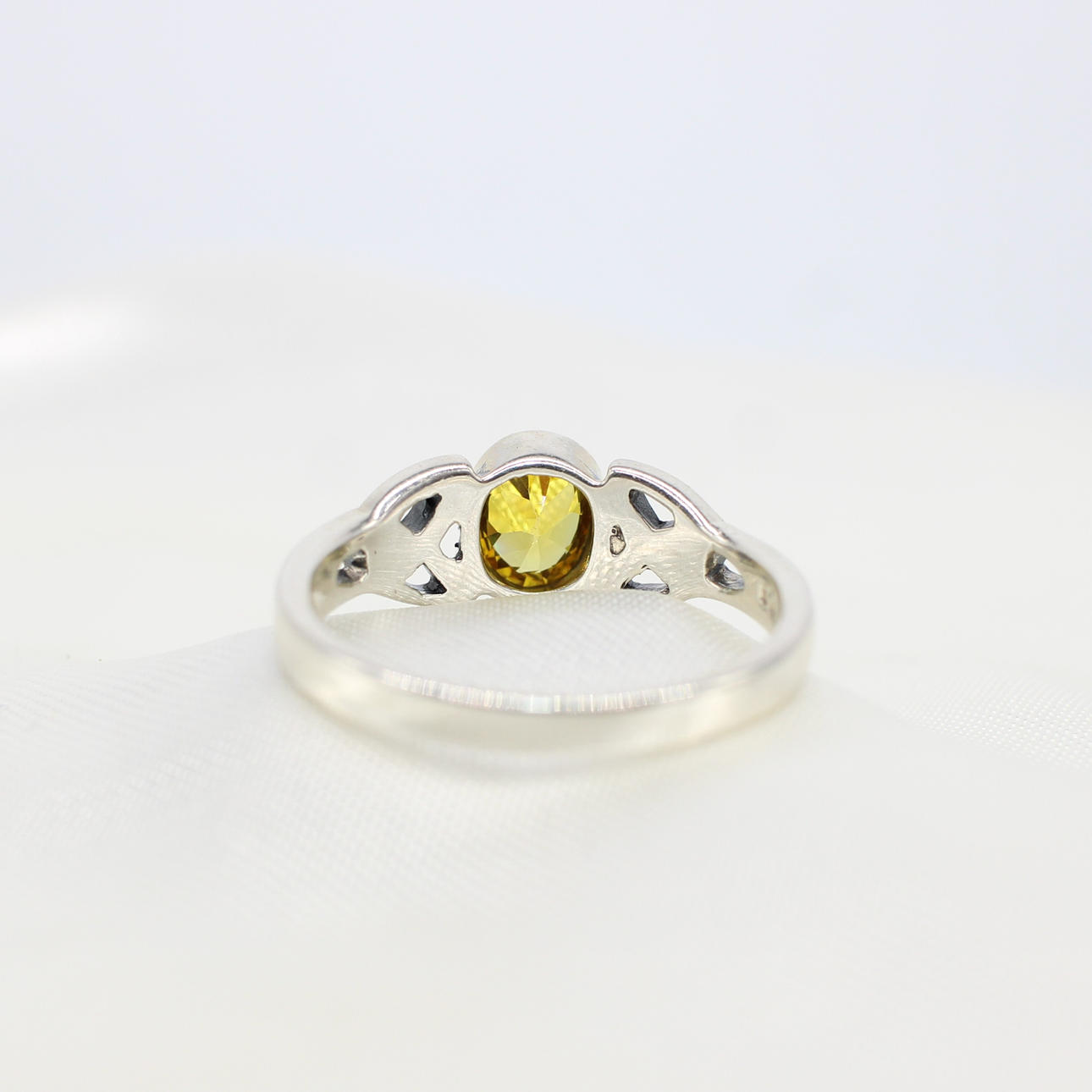 En sølvring med mønstrede skuldre, sat med gule kubiske zirkoner.