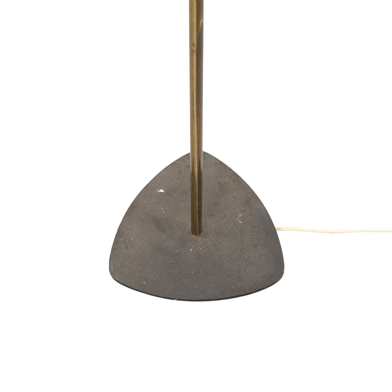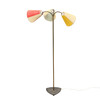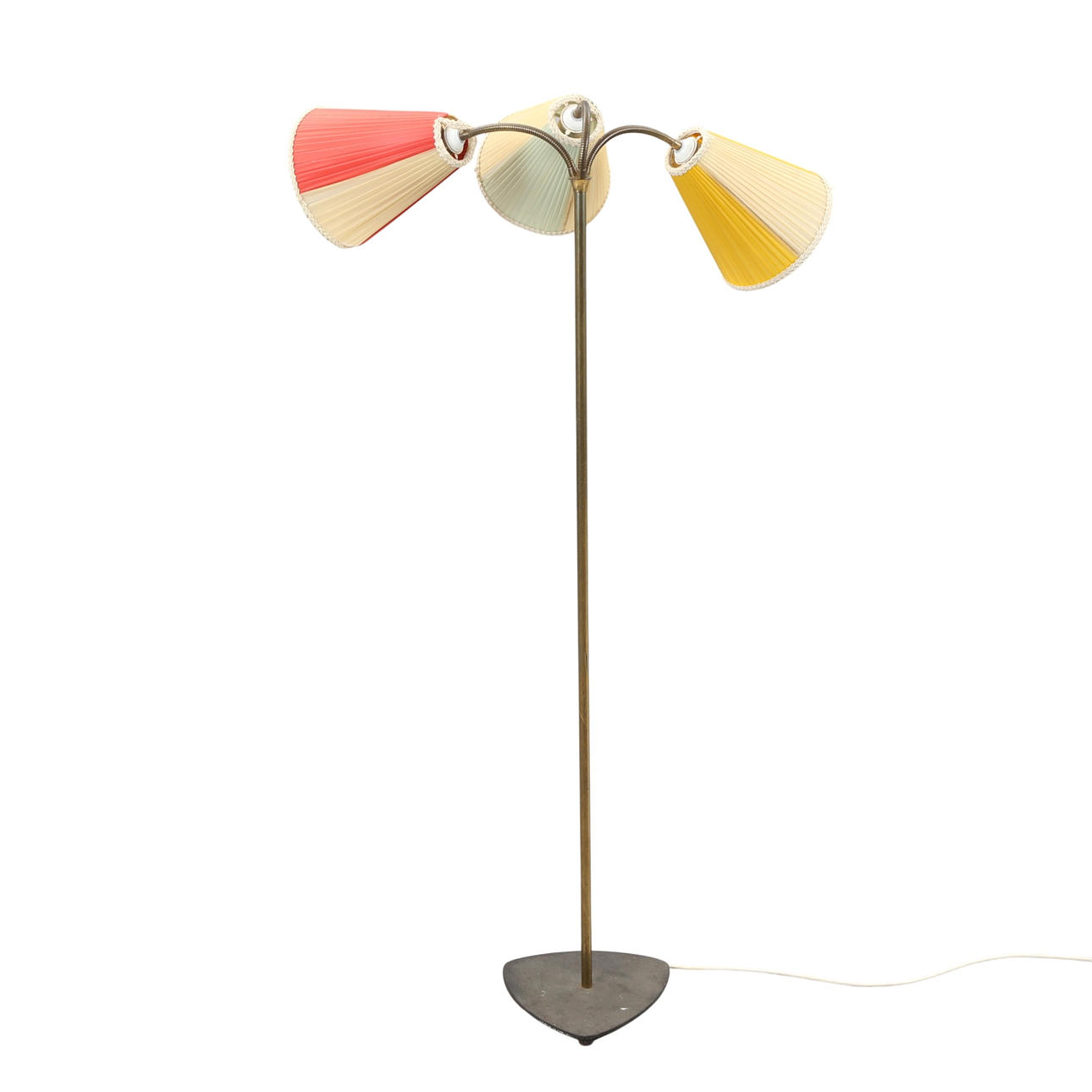 "Trafiklys" standerlampe med stamme og tre flexarme af messing, fod af støbejern. Monteret med skærme med bånd af kunstmateriale. 1950'erne. H. 164 cm.